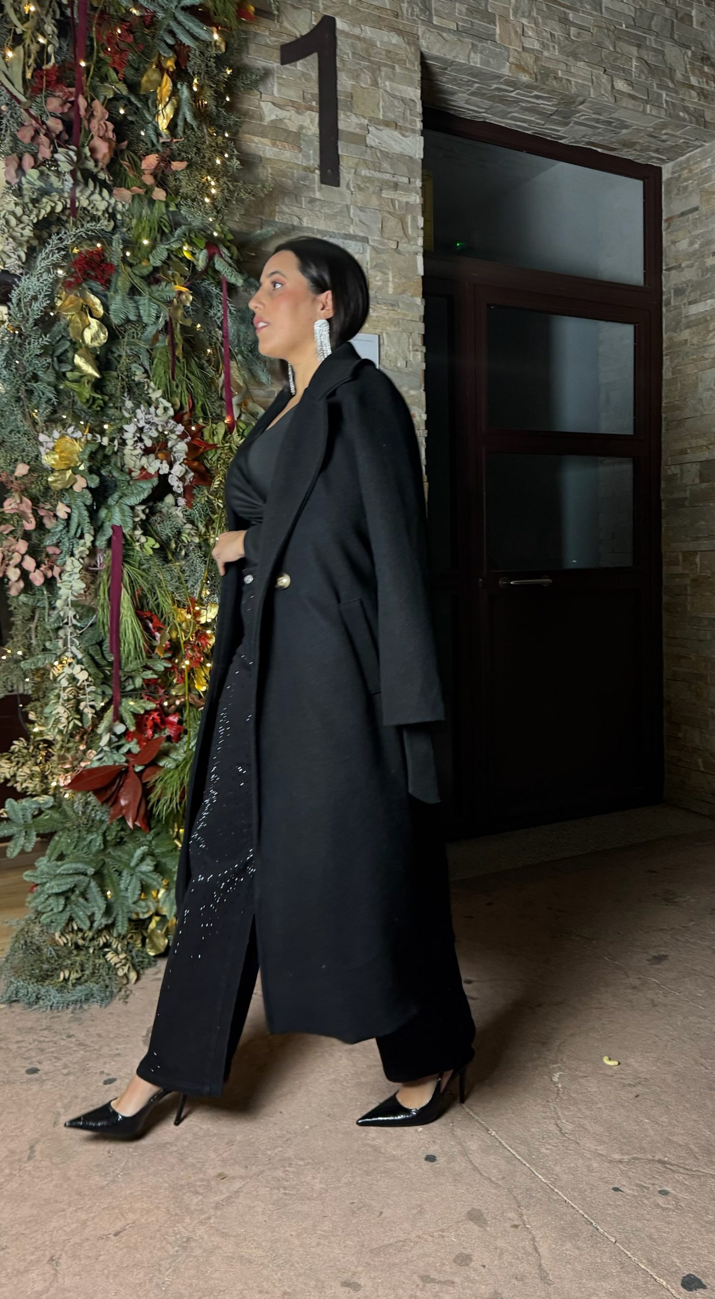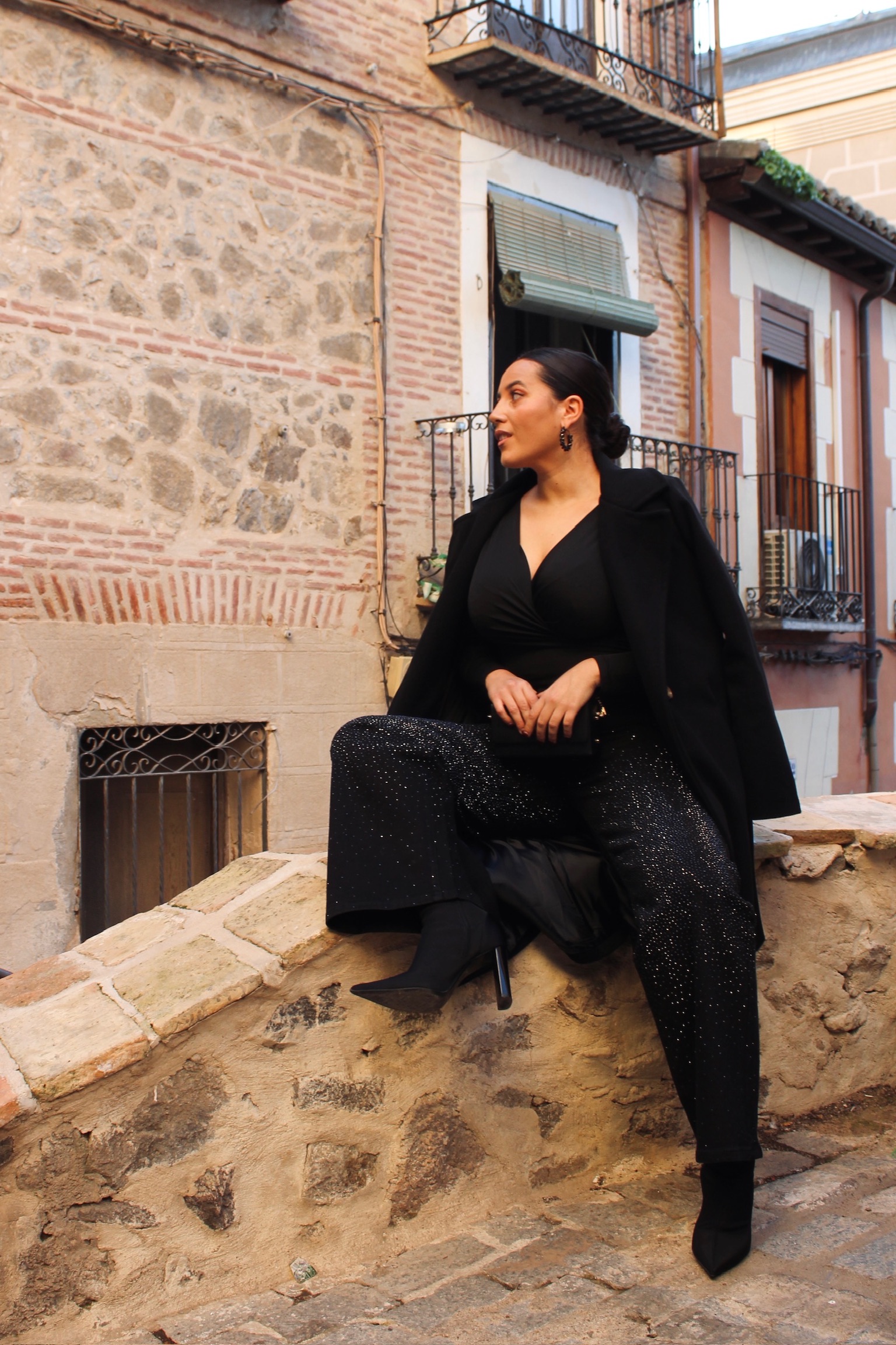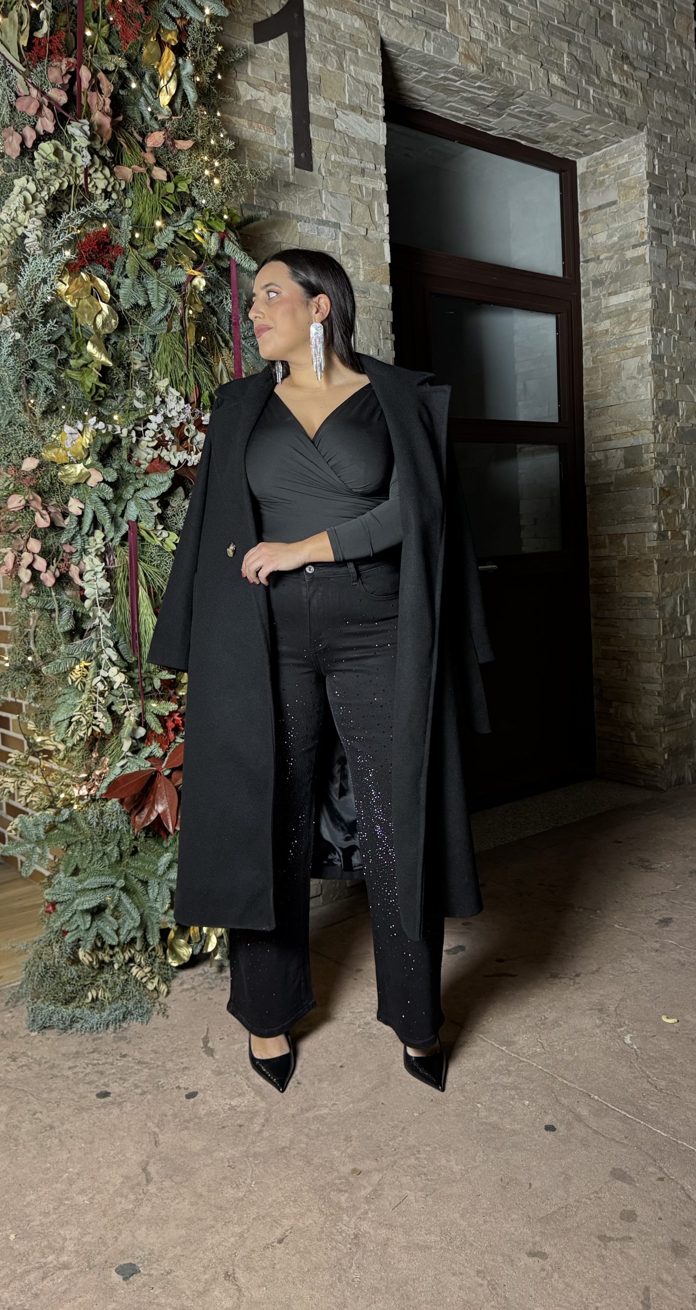 Pantalón de cinco bolsillos en color negro con detalle de brillos negros y destellos plateados.