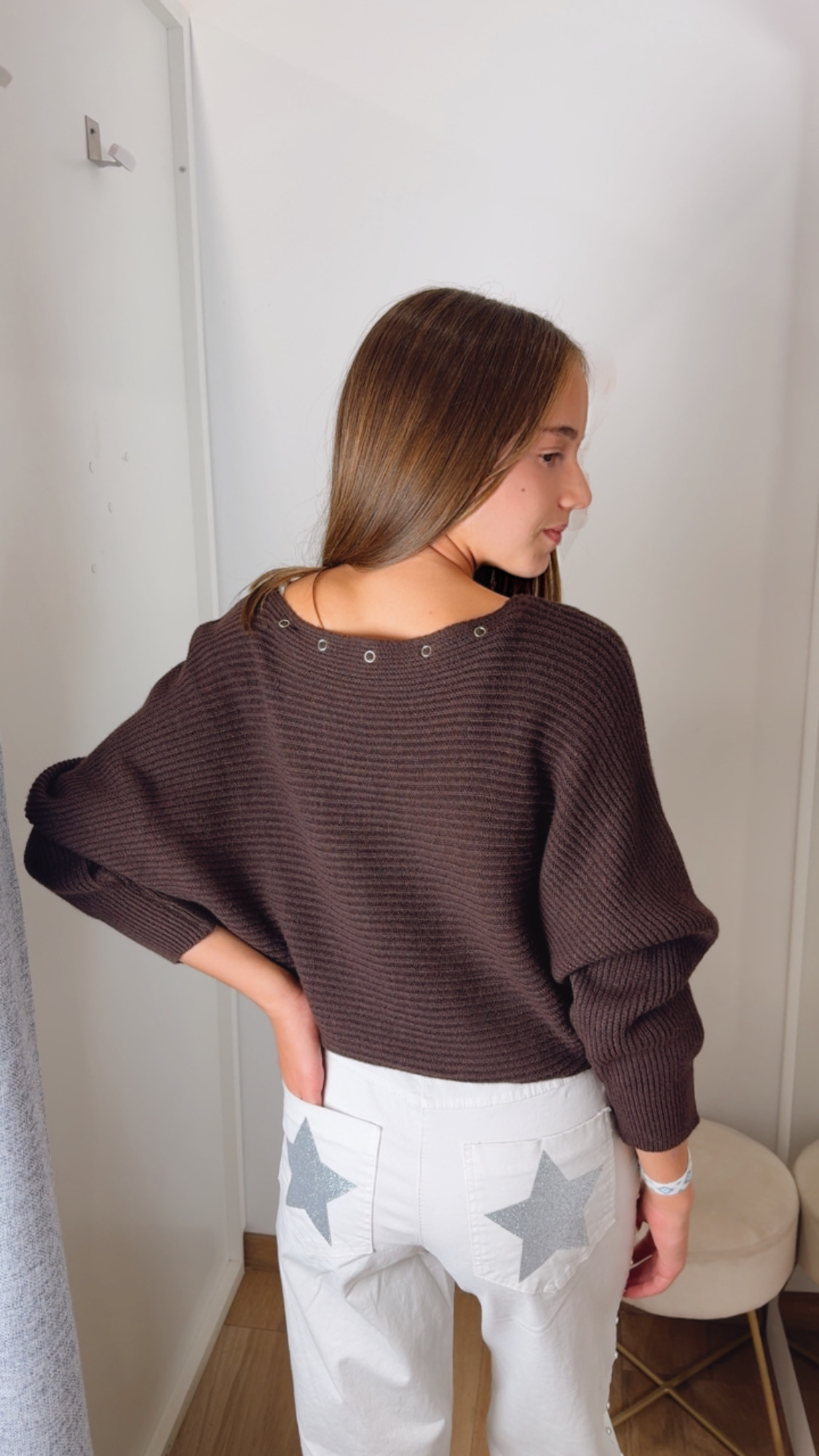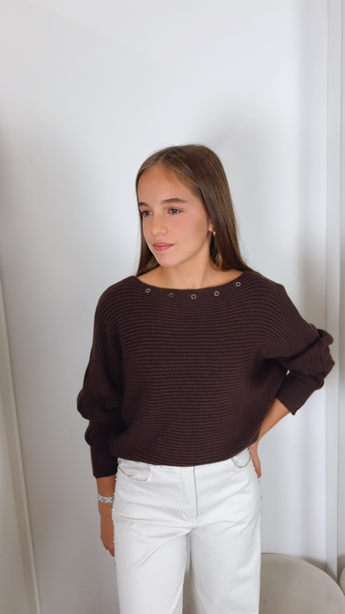 Jersey de manga larga en punto con un tacto súper suave y agradable, en color chocolate. Lleva el detalle de las anillas en la parte del cuello tanto por delante como por detrás. Se puede poner girado para que se ve un hombro o cubriendo los dos hombros.