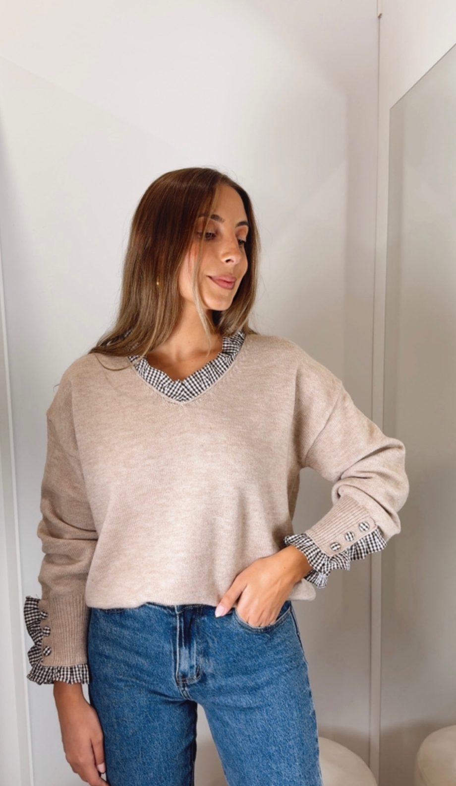 Jersey en color beige con escote a pico. Lleva el detalle del volante en cuadro vichy en marrón chocolate y crudo, tanto en la parte del escote como en los puños. También lleva un detalle de botones forrados en vichy.