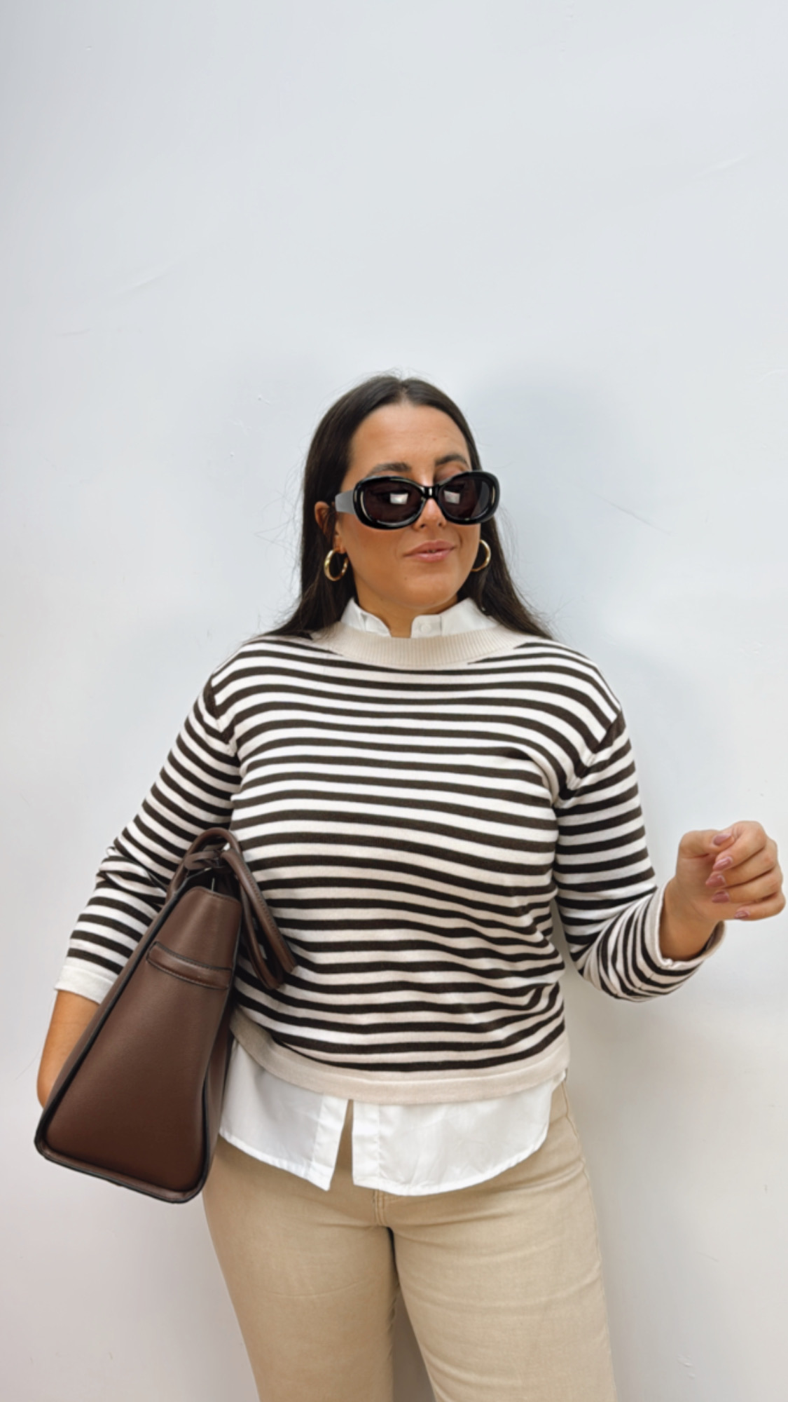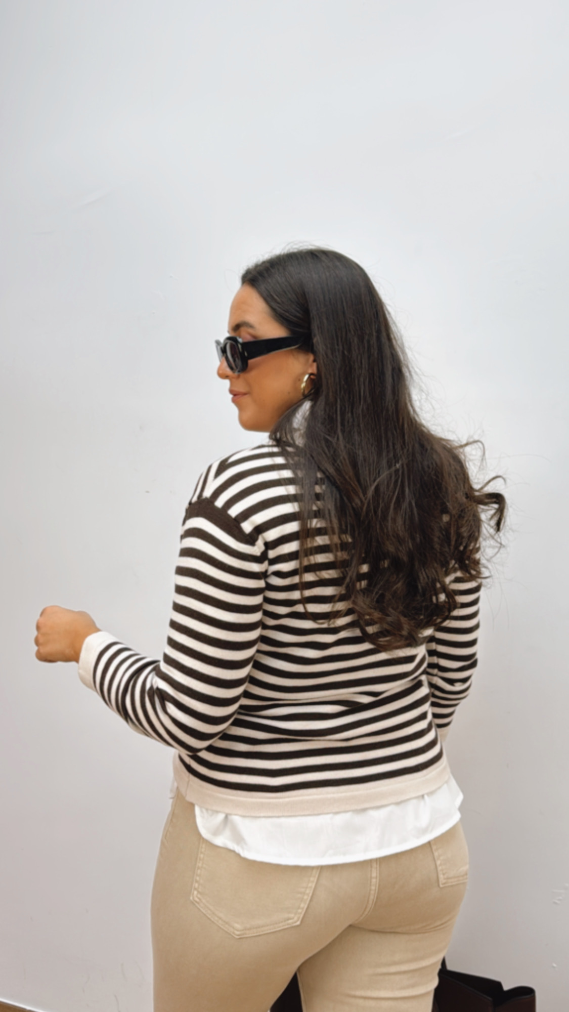 Jersey cuello redondo de rayas crudo y  marrón chocolate ,tiene un tacto súper agradable y gustoso. Sienta   ideal. Un básico imprescindible en nuestro armario esta temporada.