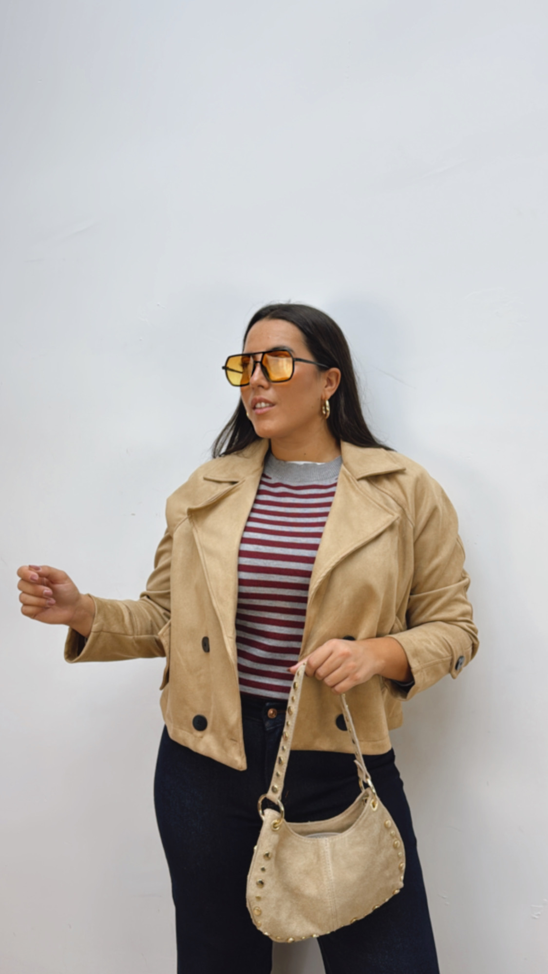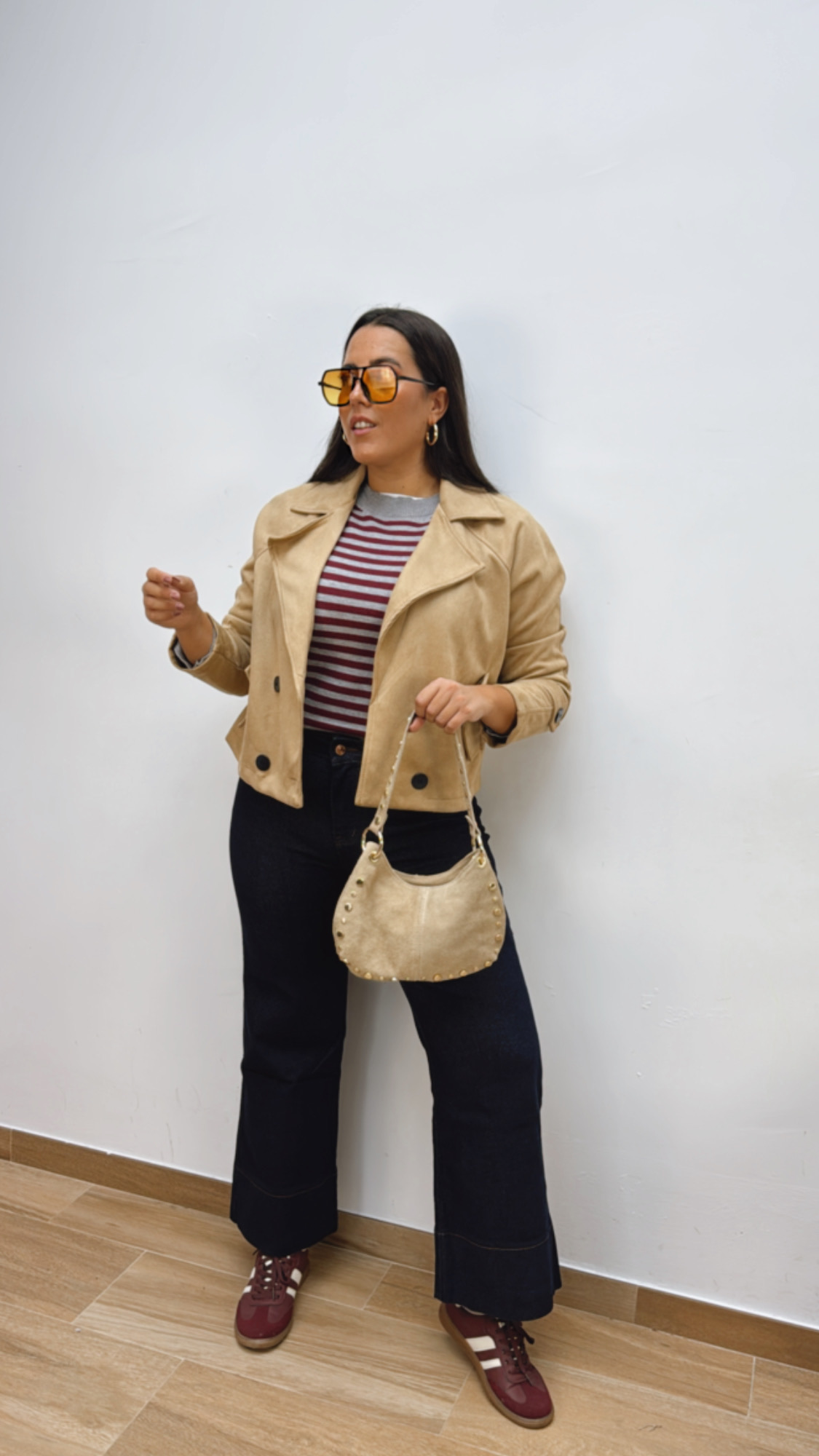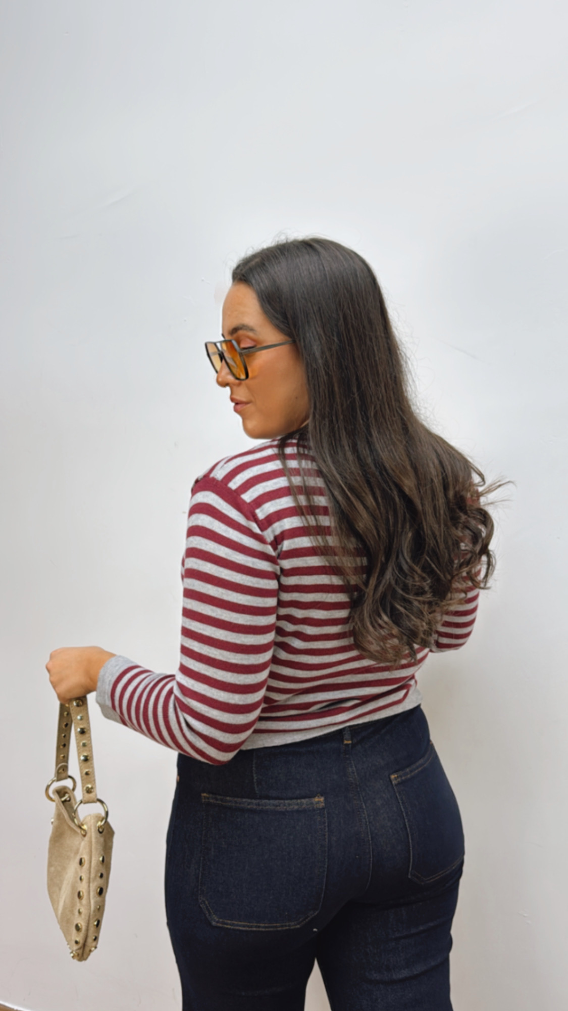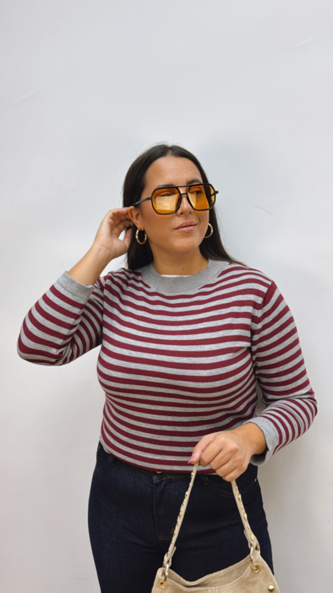 Jersey cuello redondo de rayas gris y Burdeos , tiene un tacto súper agradable y gustoso. Sienta ideal. Un básico imprescindible en nuestro armario esta temporada.