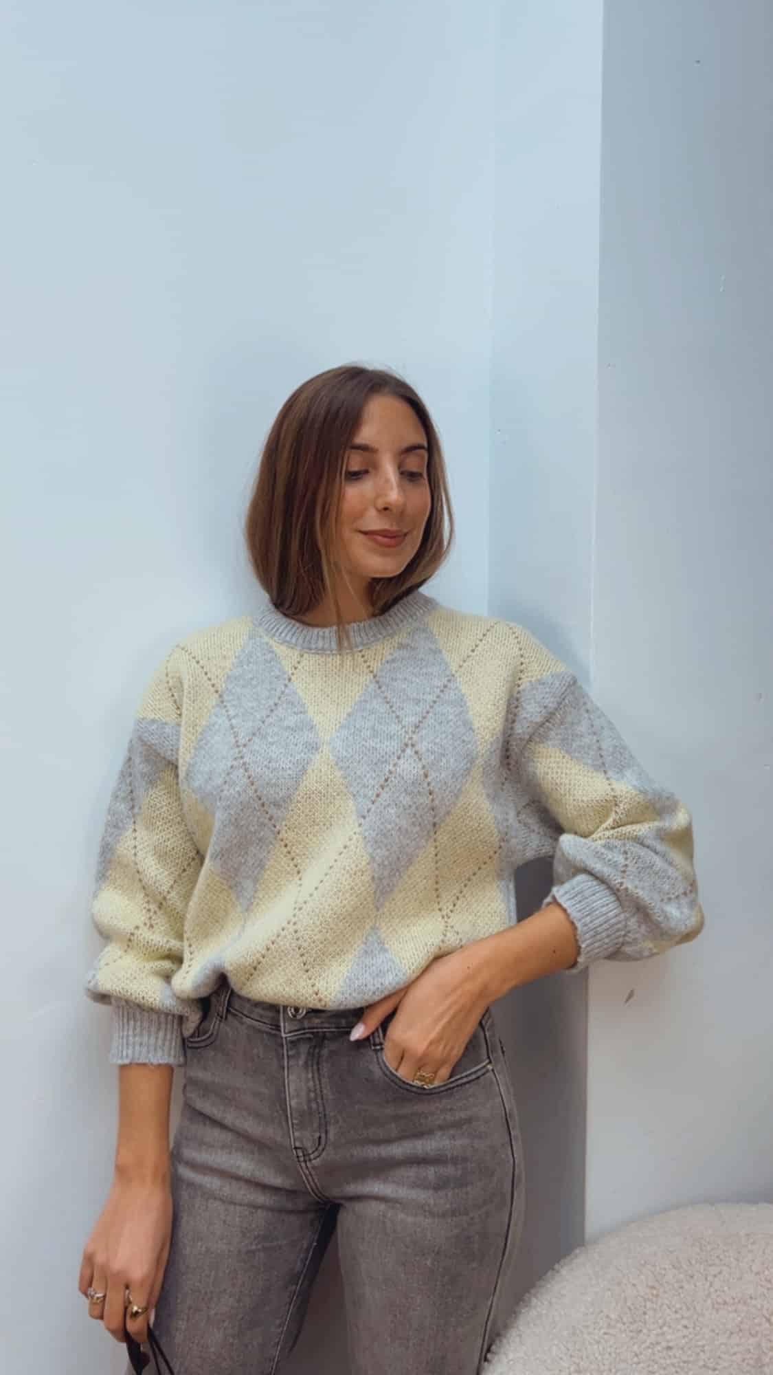 Jersey de cuello redondo y manga larga en colores amarillo pastel y gris, con detalle de rombos.