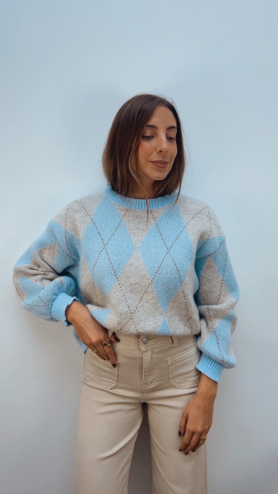 Jersey de cuello redondo y manga larga en colores azul cielo y beige, con detalle de rombos.