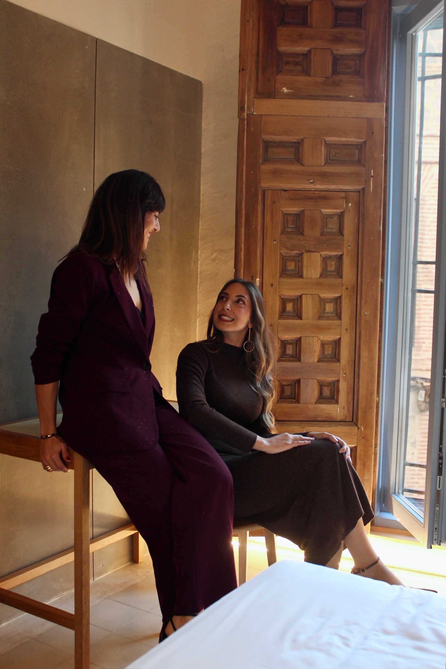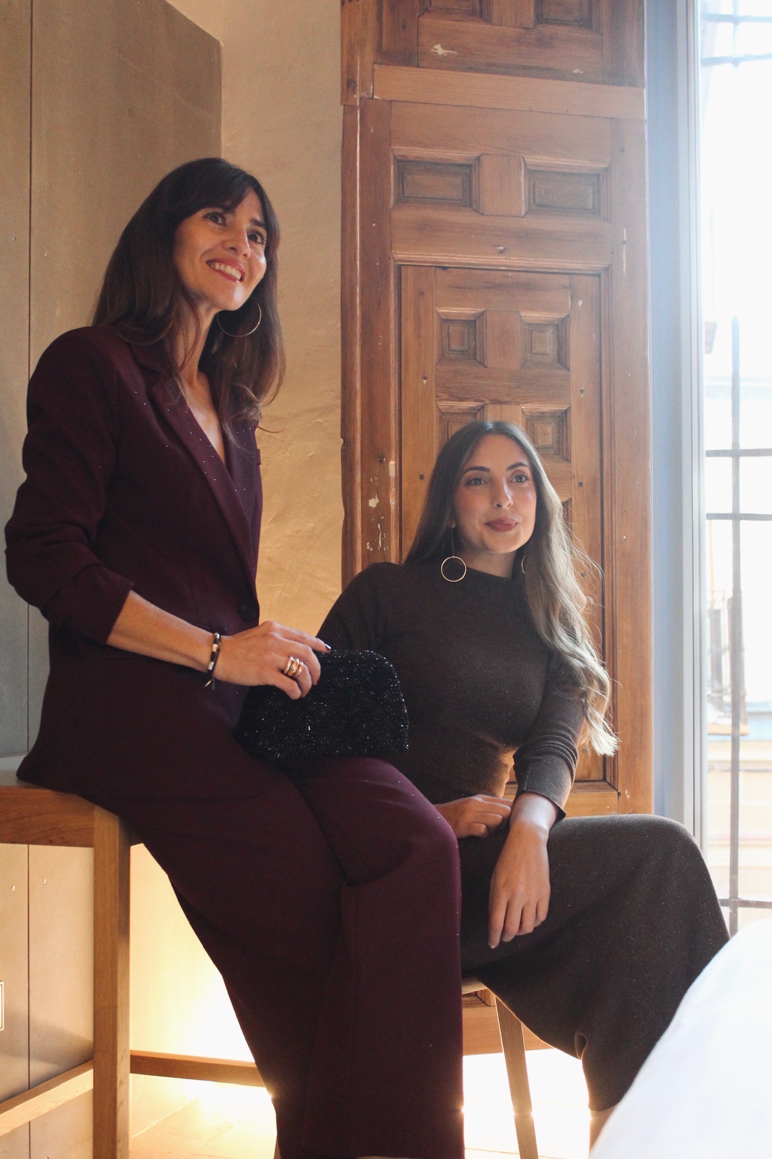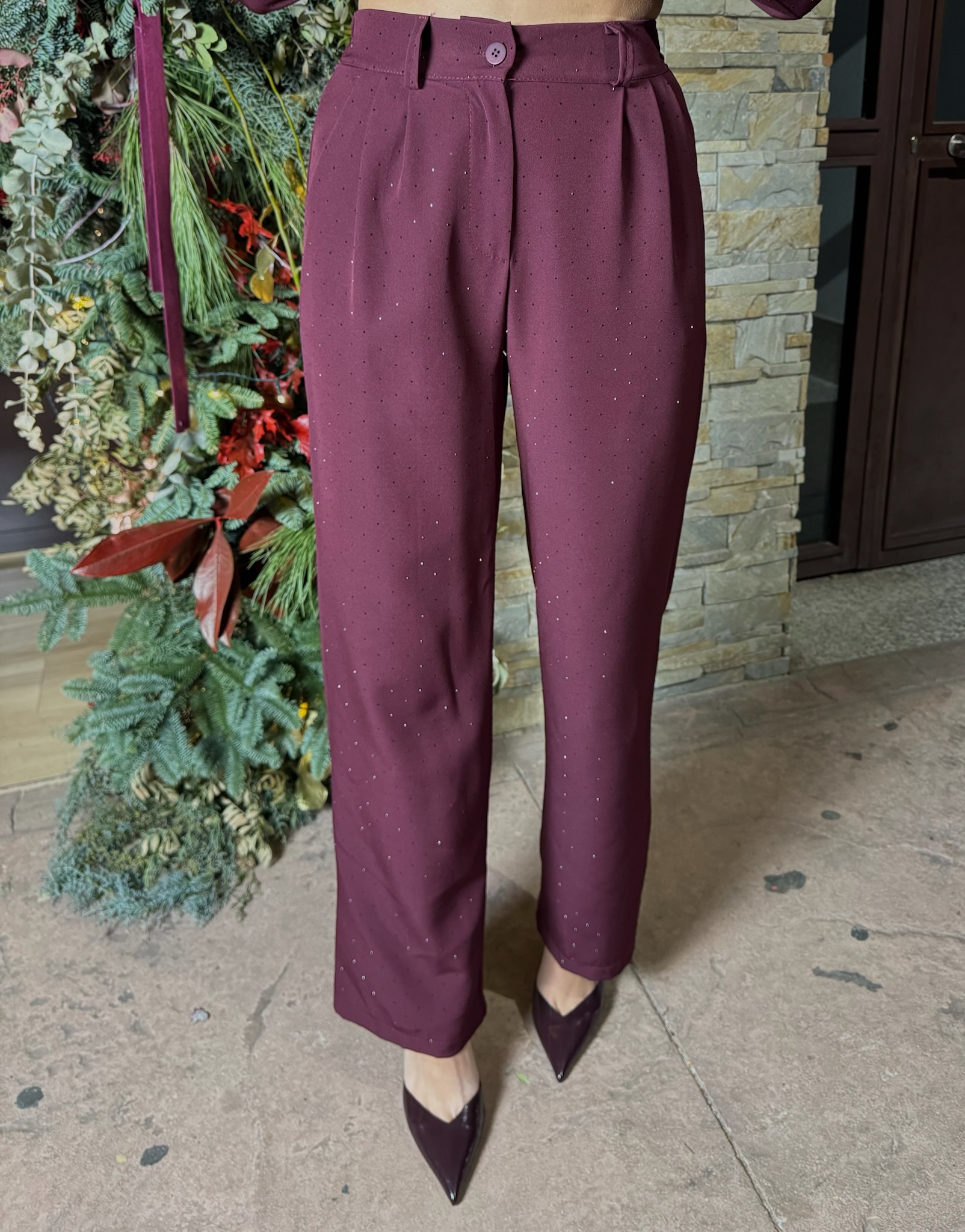 Pantalón de pinza en tejido crepé y color burdeos con detalle de brillos en color negro. Sienta espectacular y es un fondo de armario para fiestas!