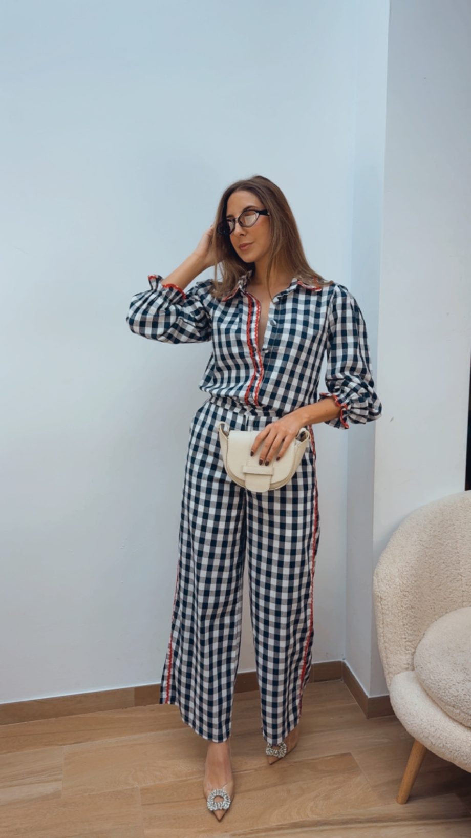 Pantalón de pernera recta en cuadro vichy azul marino y blanco, lleva bolsillos verdaderos y el interior va totalmente forrado. Se abrocha con botón y cremallera y lleva el detalle de la pasamanería en color coral en la parte lateral de las piernas.