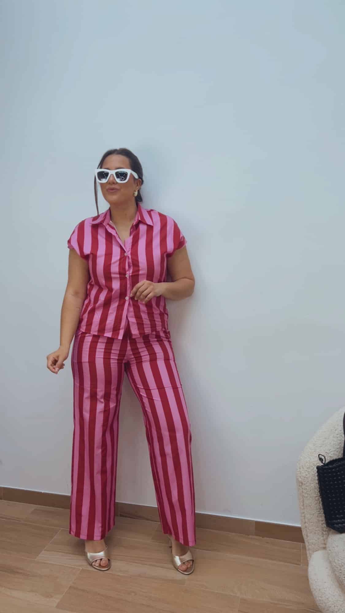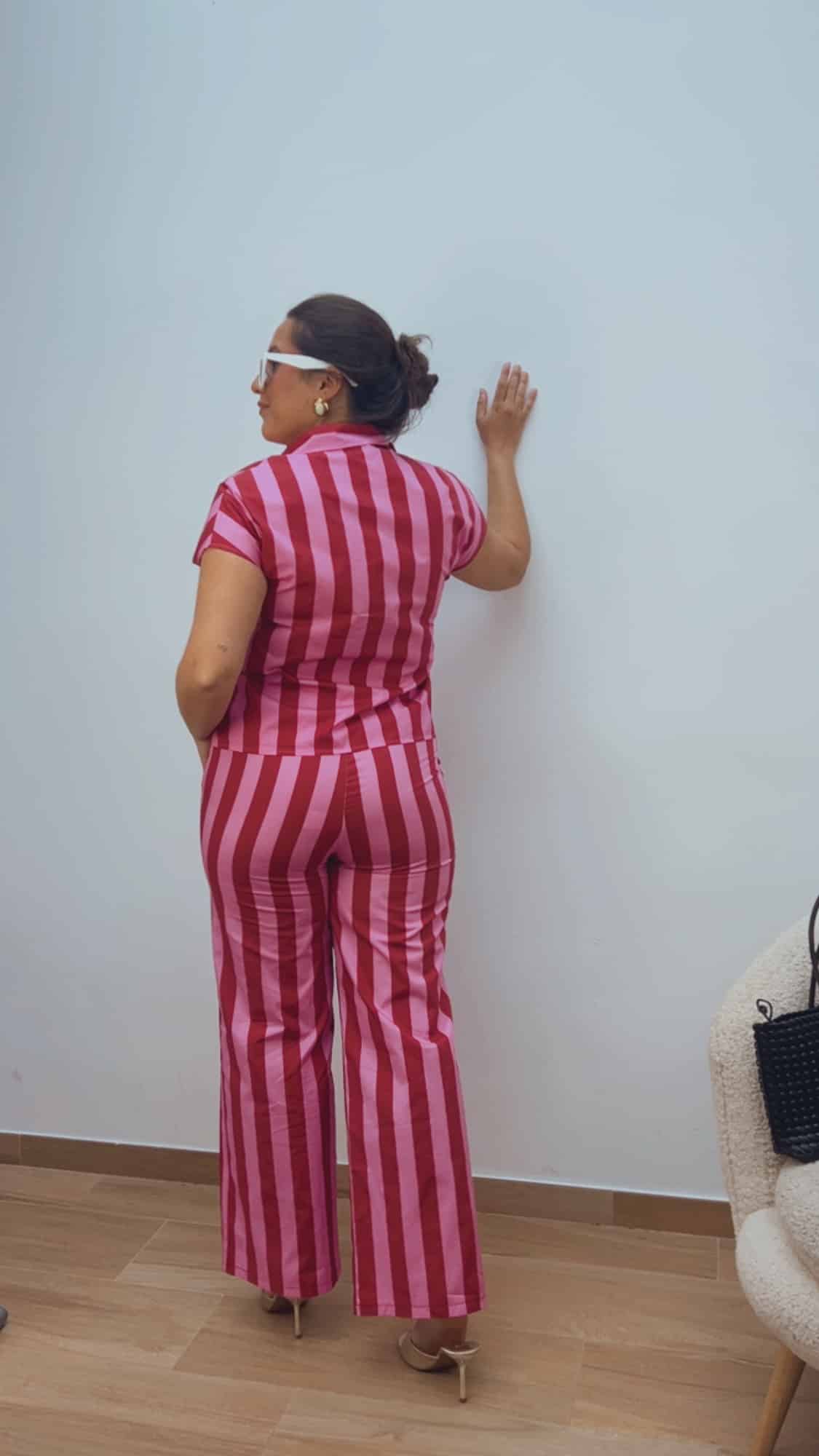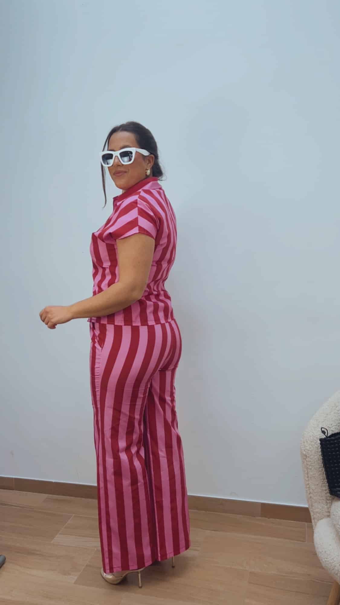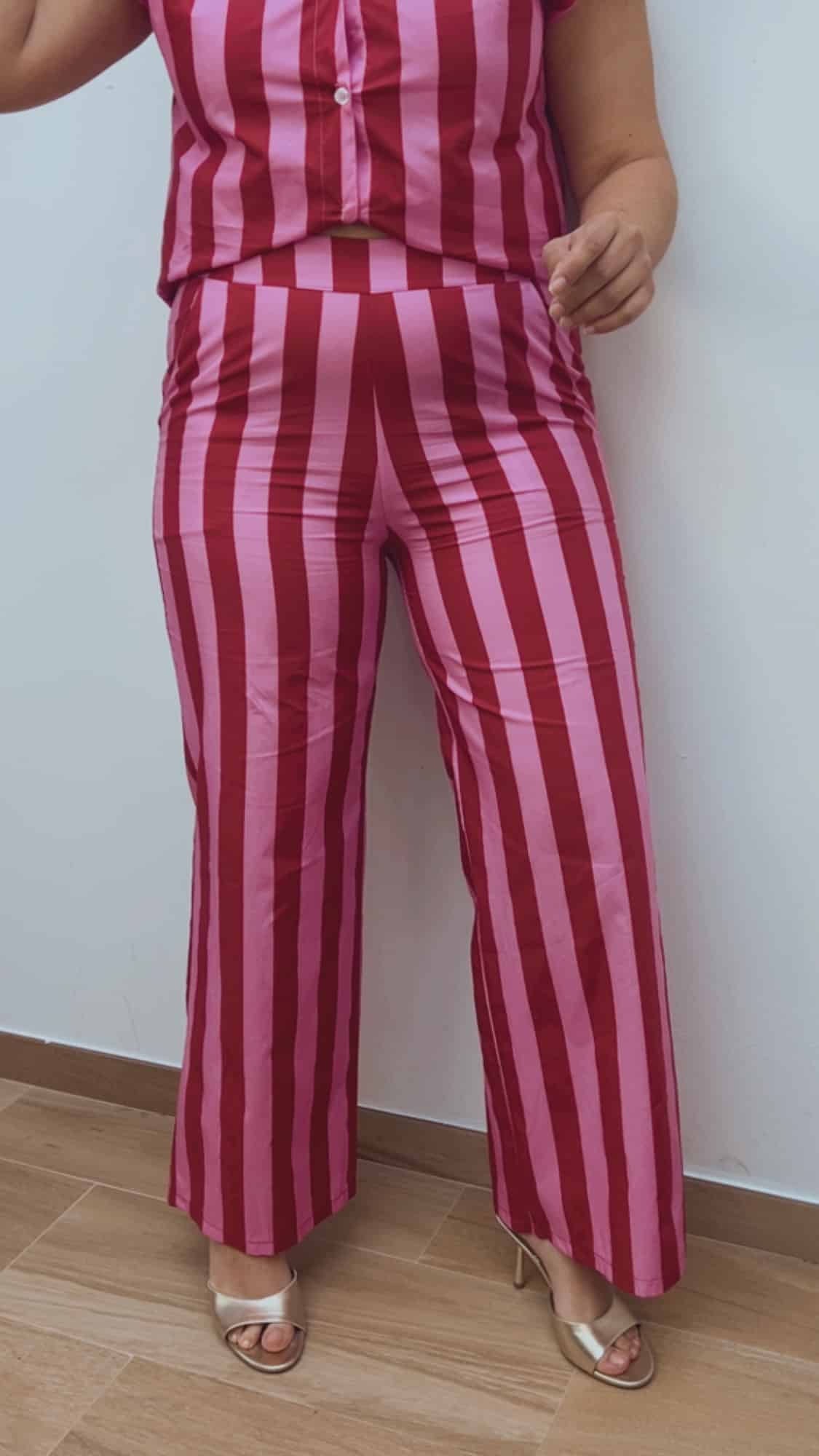 Pantalón de rayas anchas en burdeos y rosa, muy favorecedor y fácil de combinar. Cuenta con cinturilla delantera con bolsillos y goma en la parte trasera, lo que permite un ajuste cómodo y adaptable.