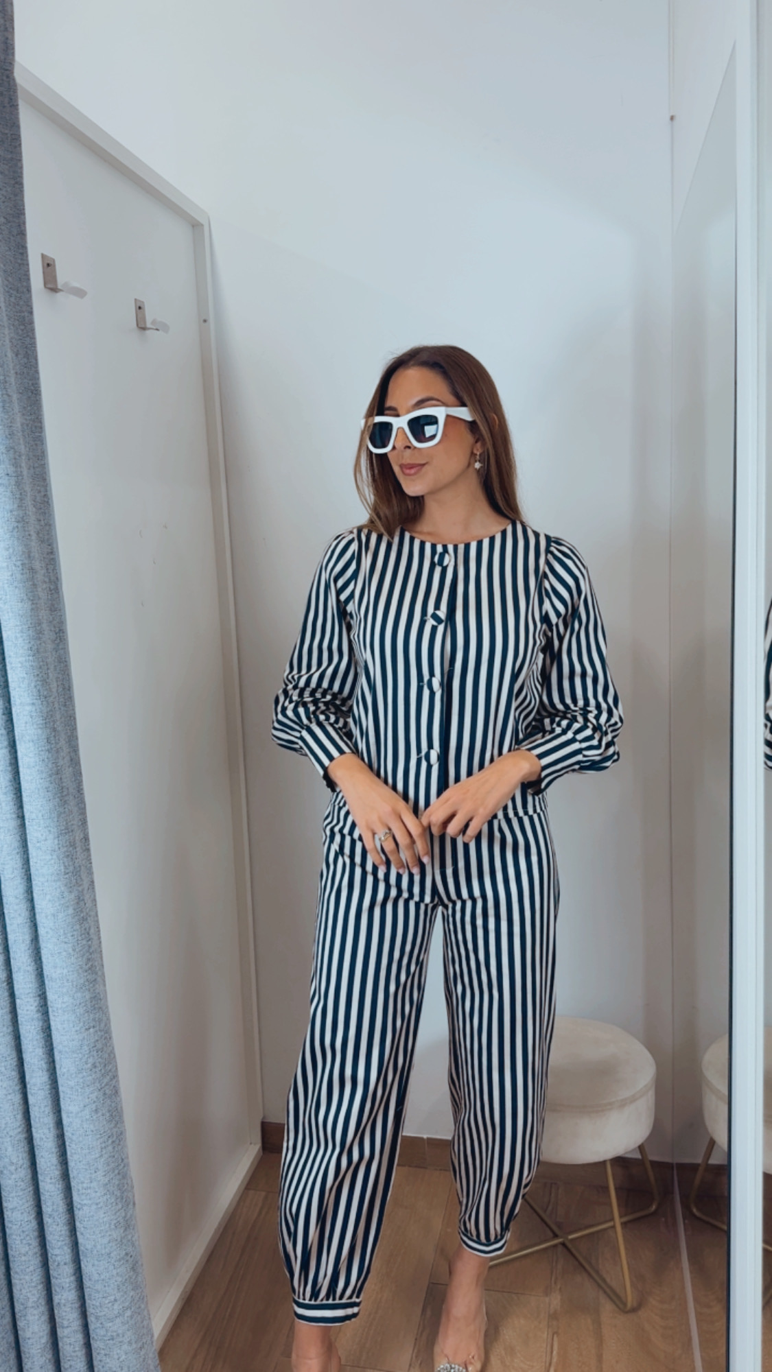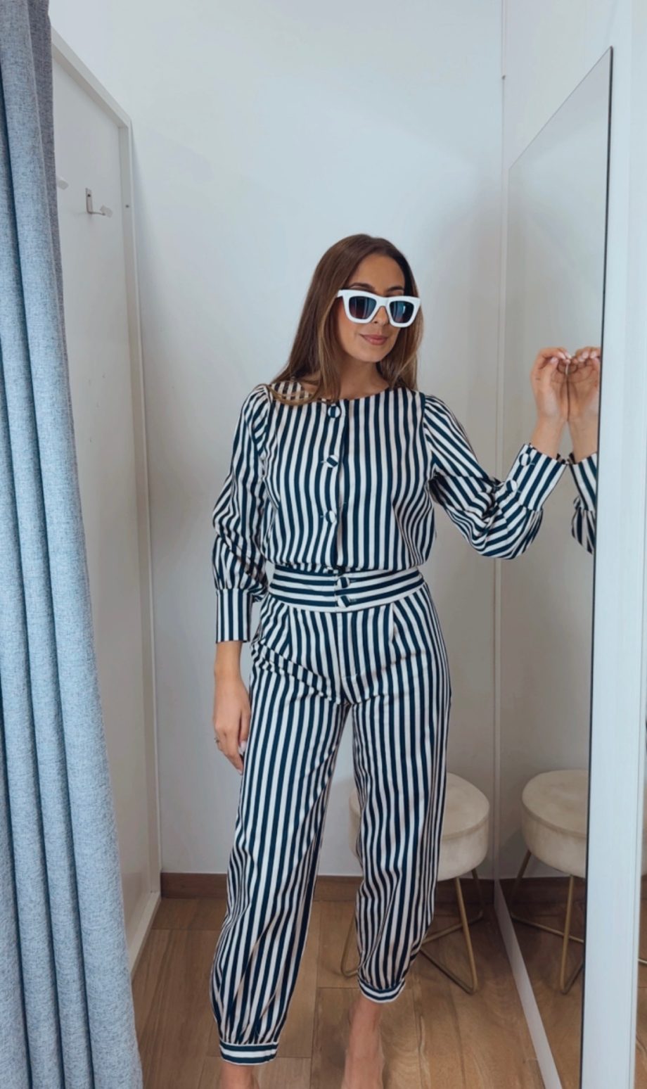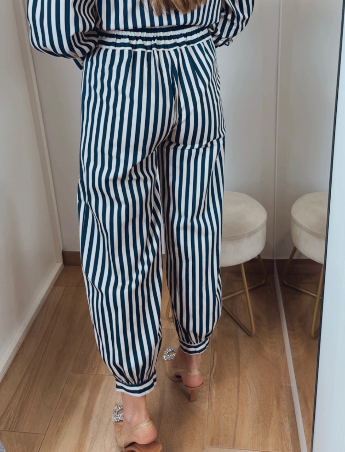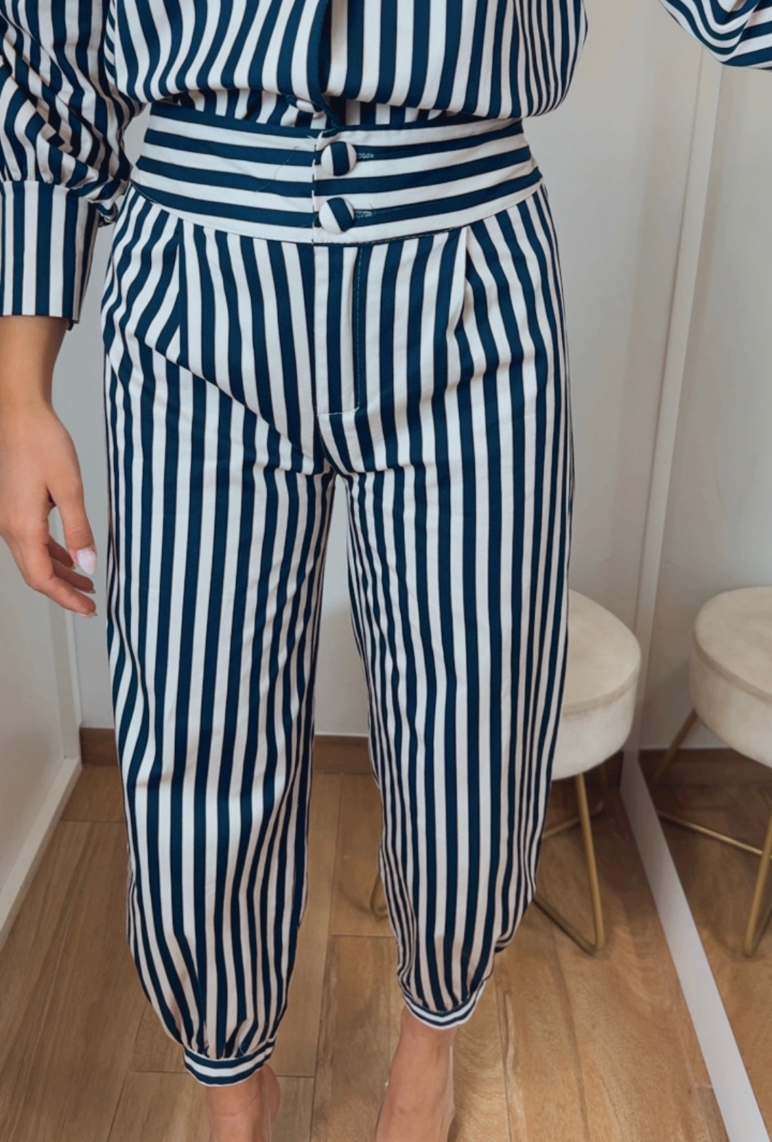 Pantalón de rayas en azul marino, crudo y detalle en tono café, un diseño elegante y fácil de combinar. Cuenta con cintura fija en la parte delantera y goma en la parte trasera, lo que permite una mejor adaptación al cuerpo.