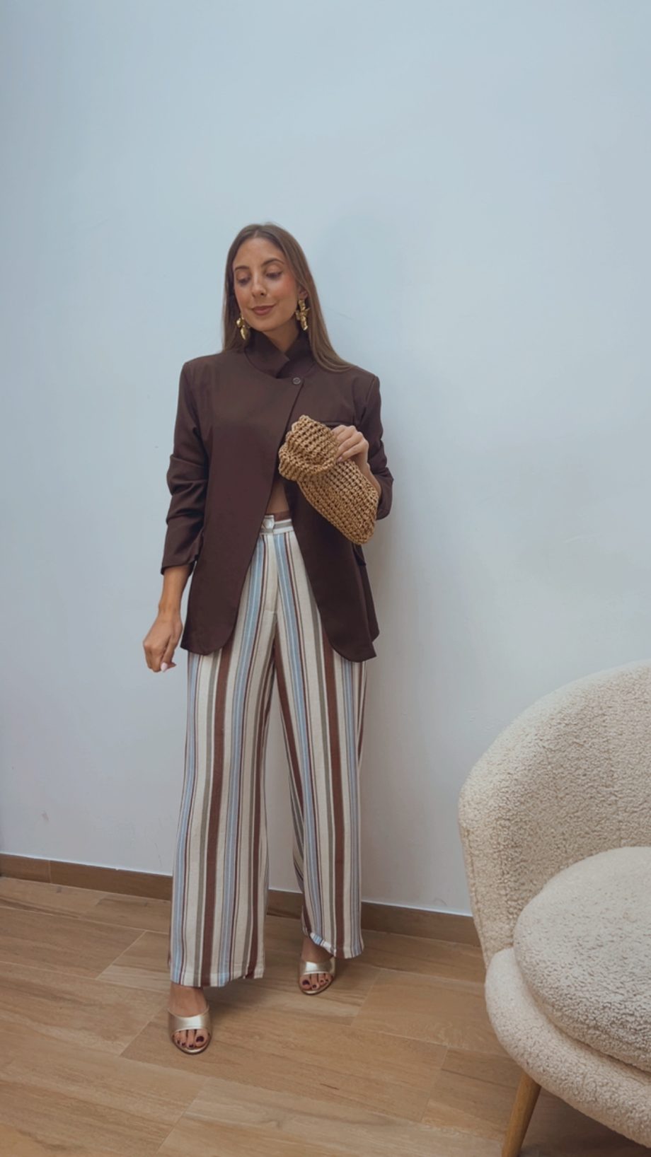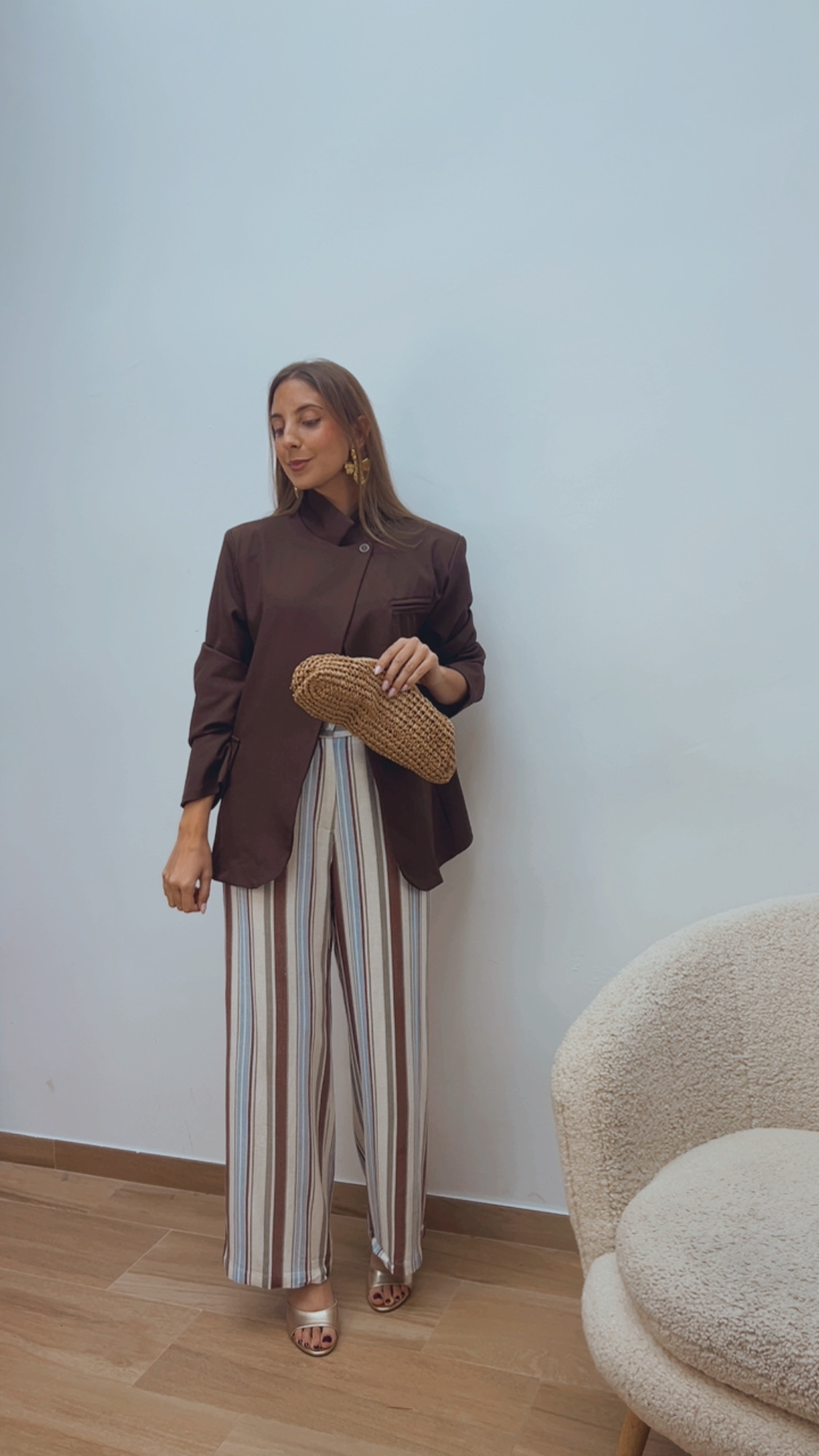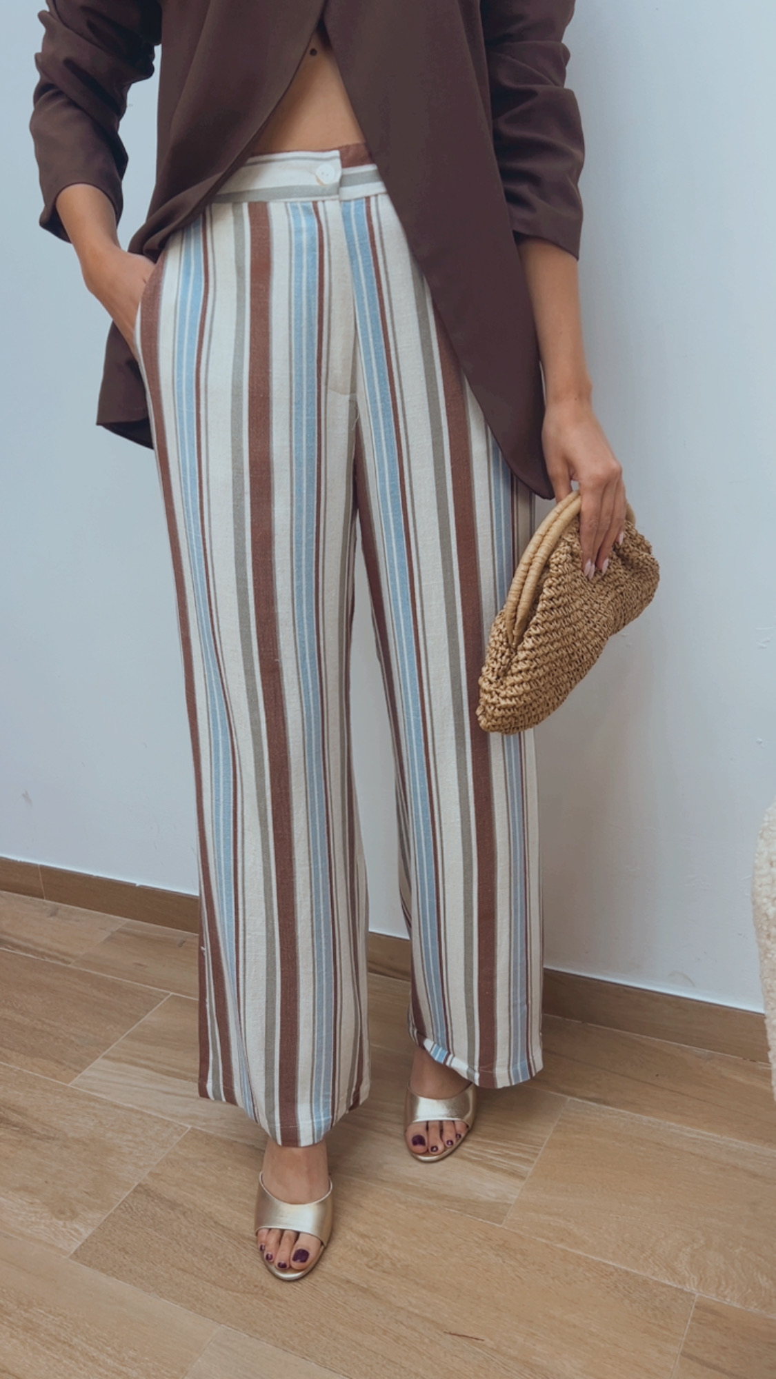 Pantalón de rayas en tonos verde, crudo, chocolate y azul, un diseño original y muy favorecedor. Cuenta con cierre de botón y cremallera, bolsillos y goma en la parte trasera, lo que permite un ajuste cómodo y adaptable.