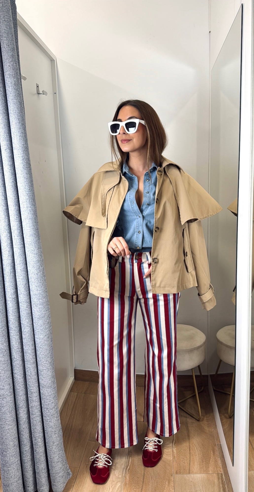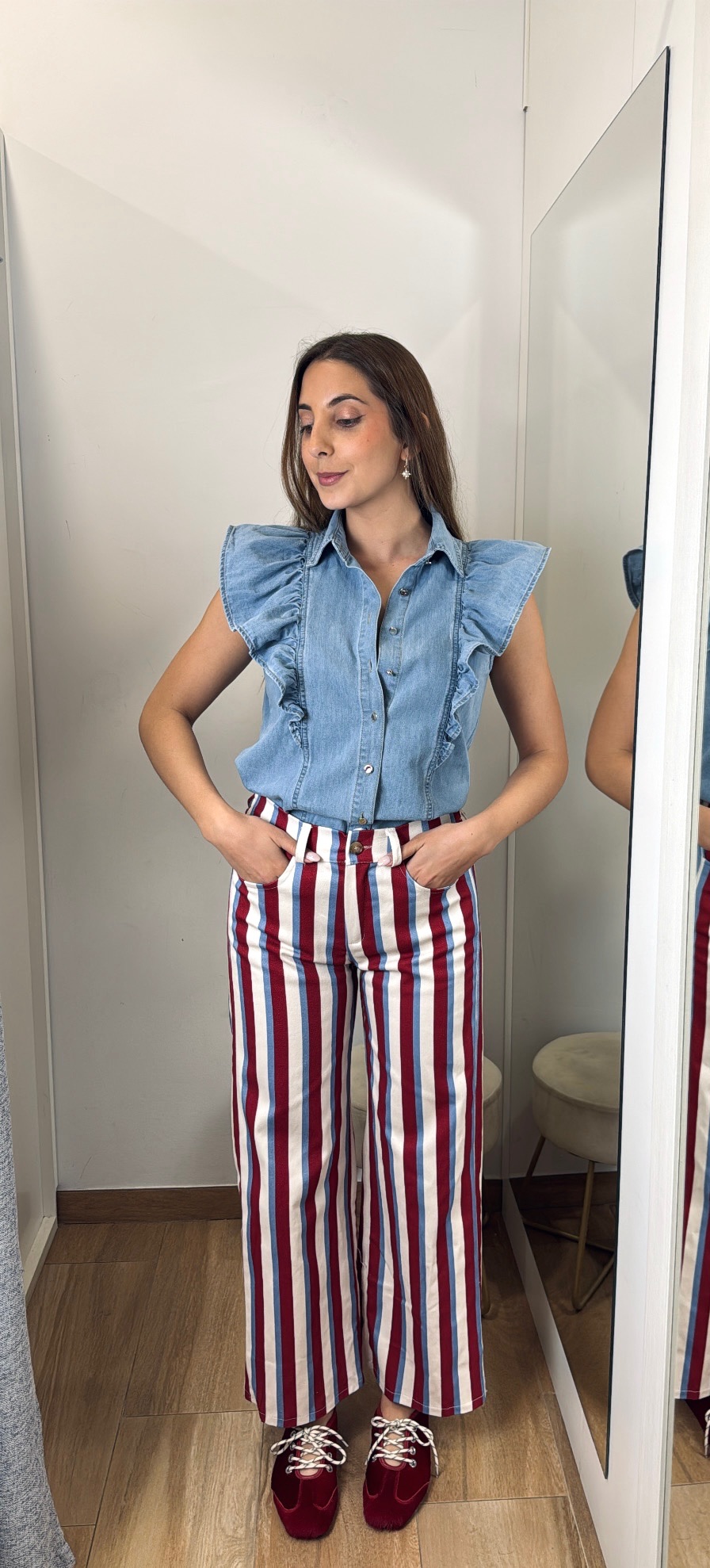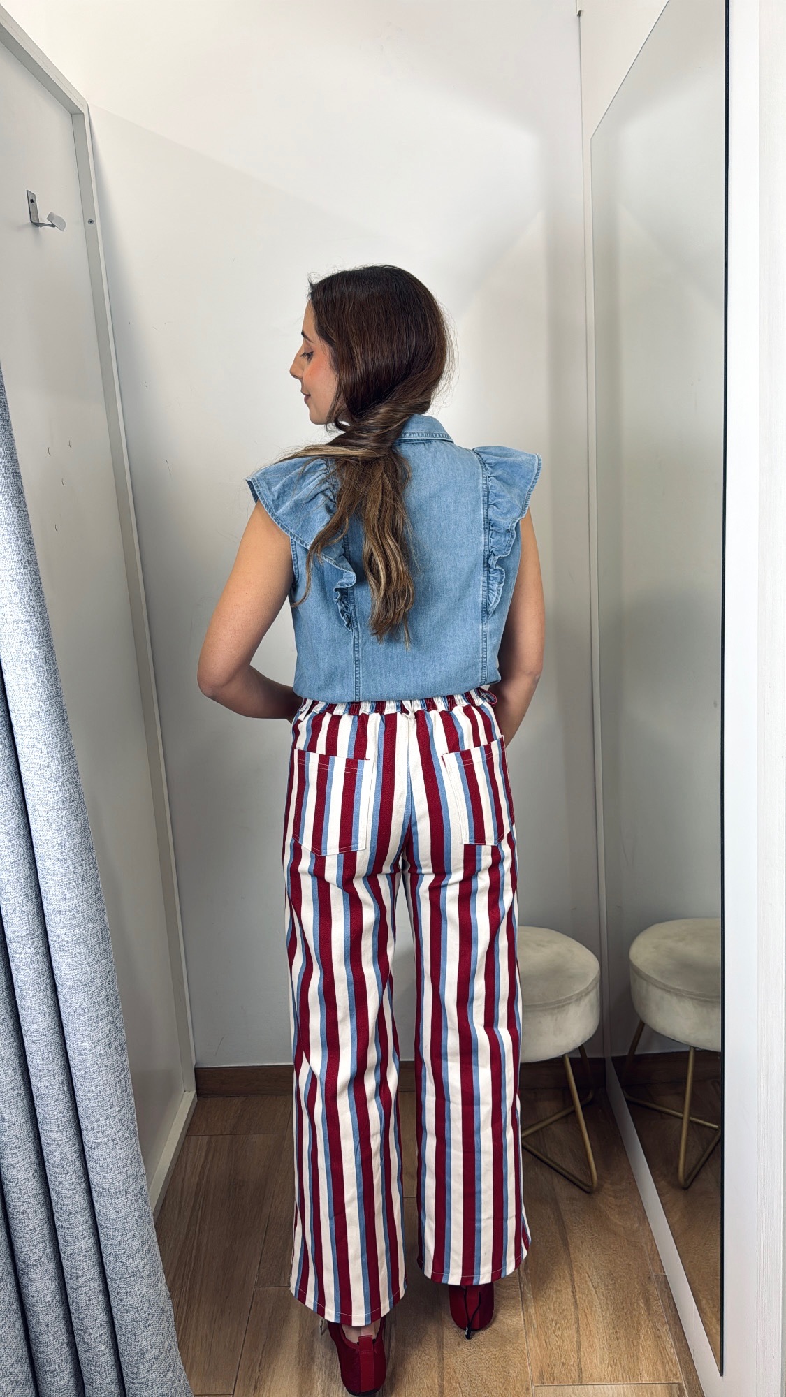 Pantalón de rayas en tonos burdeos, beige y azul, con corte wide leg muy favorecedor. Confeccionado en tejido tipo denim, cuenta con cierre de botón y cremallera y bolsillos delanteros y traseros.