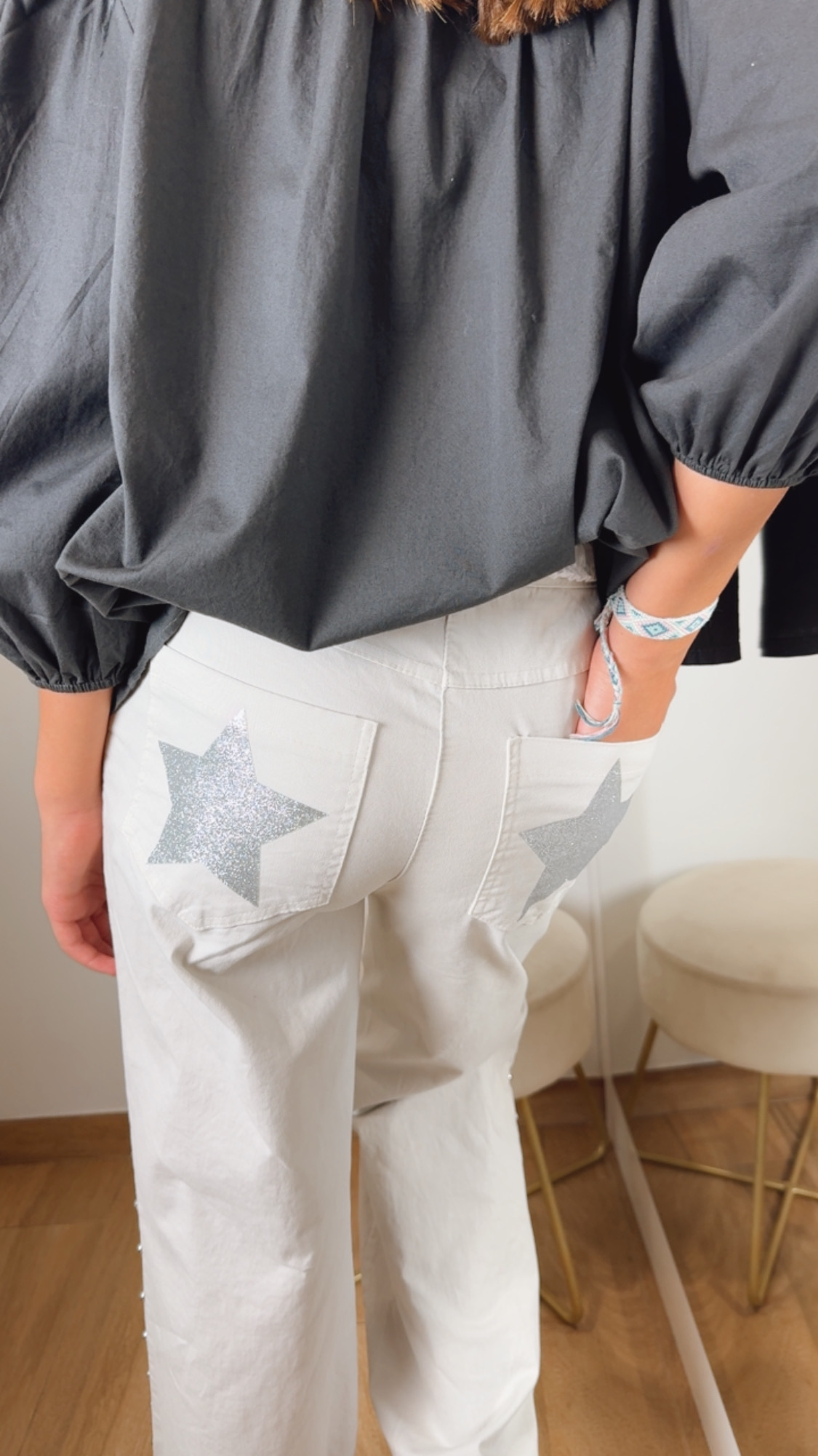 Pantalón en color beige cinco bolsillos con detalle de las estrellas en la parte del culete y tachuelas en los laterales de la pierna en color plateado.