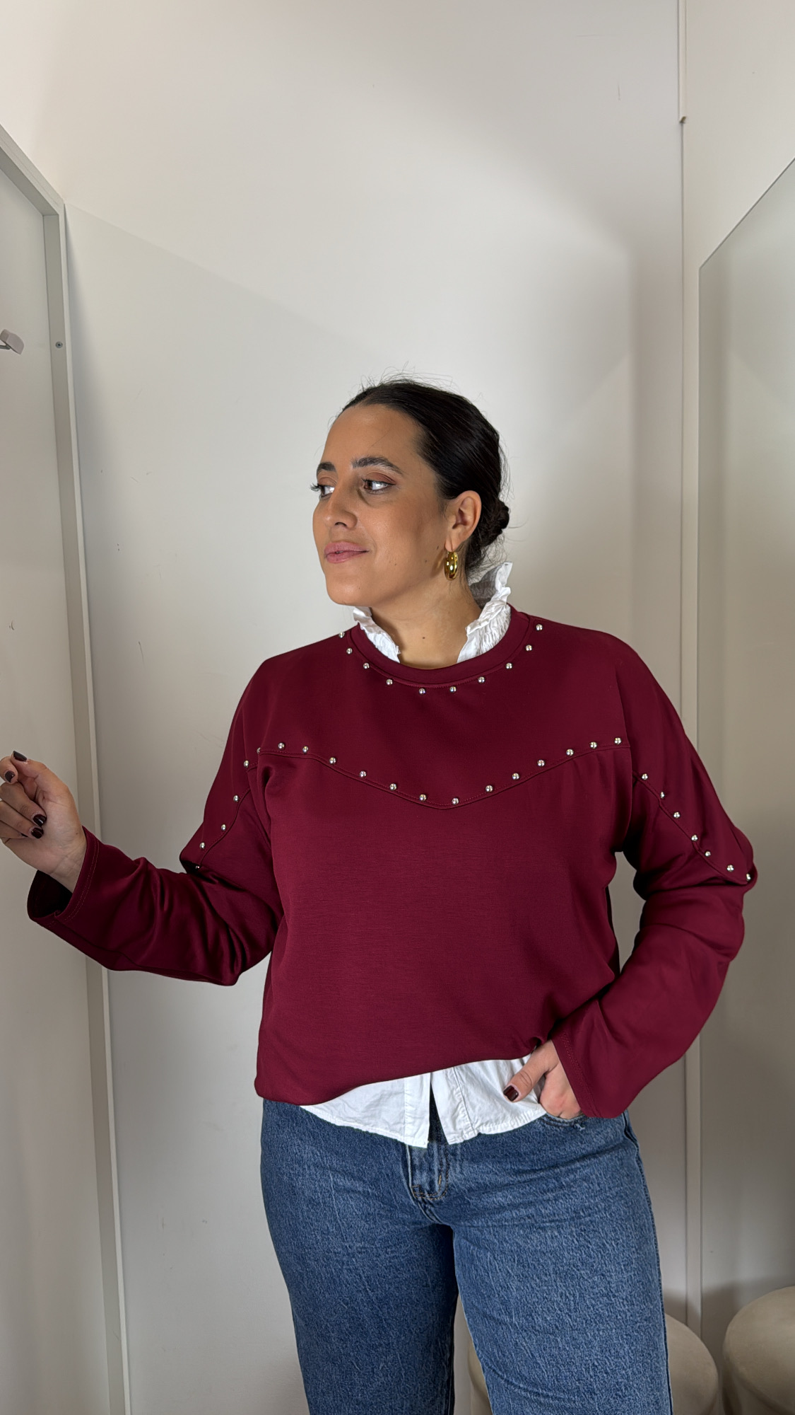 Sudadera en color burdeos con cuello redondo y detalle de tachuelas en color plata.