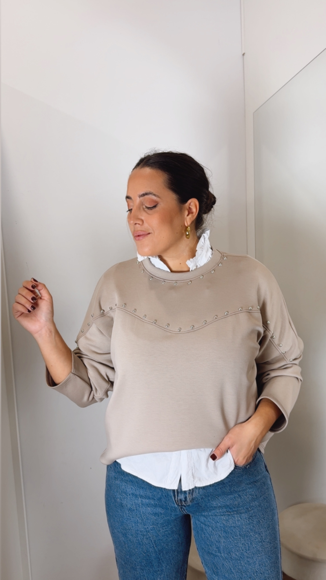 Sudadera en color topo con cuello redondo y detalle de tachuelas en color plata.