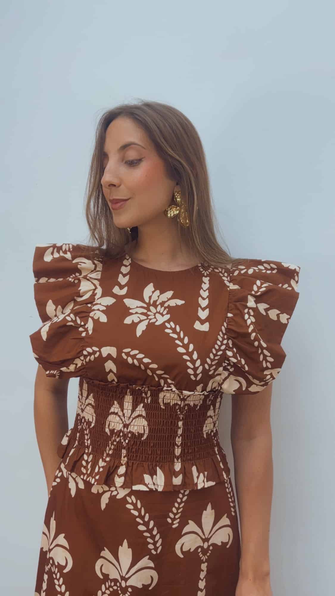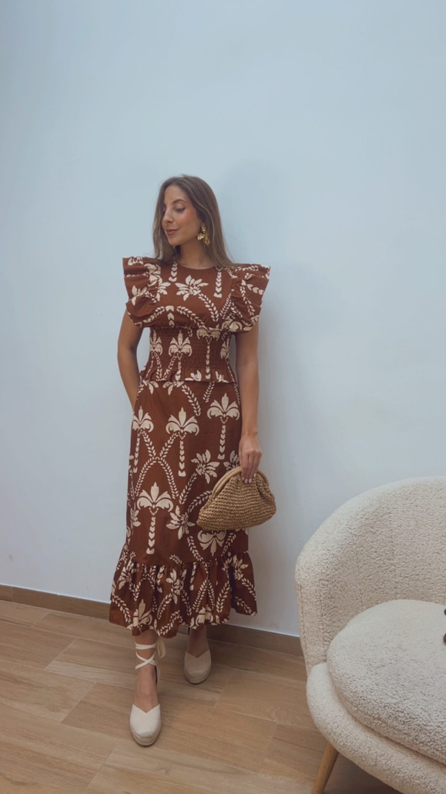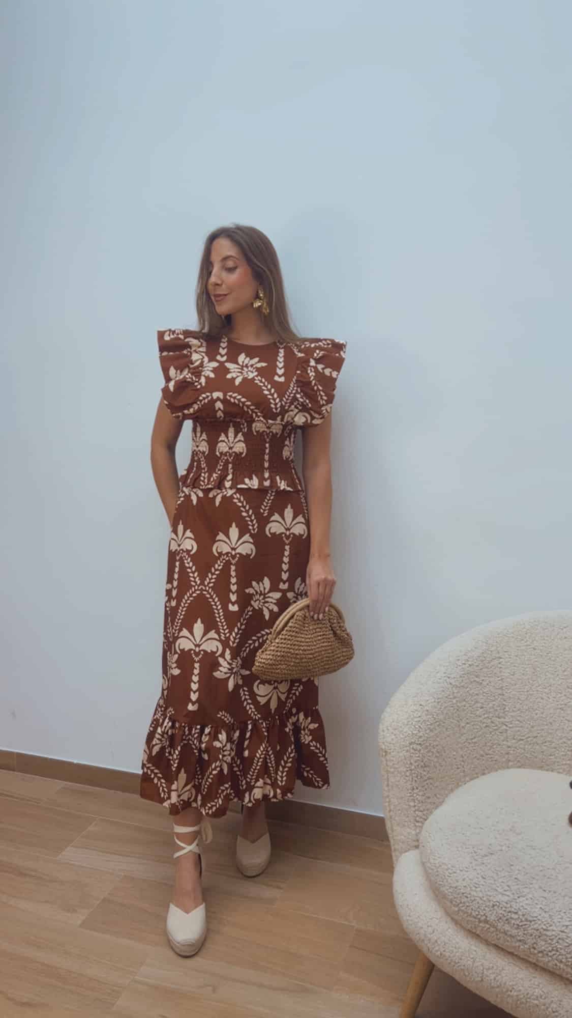 Espectacular vestido con panel de abeja en la cintura, que se adapta perfectamente al cuerpo y realza la silueta. Diseño con cierre en la parte trasera con botón y detalles de volantes en tonos marrón y crudo, incluyendo volante en el bajo que aporta movimiento y un acabado muy especial.