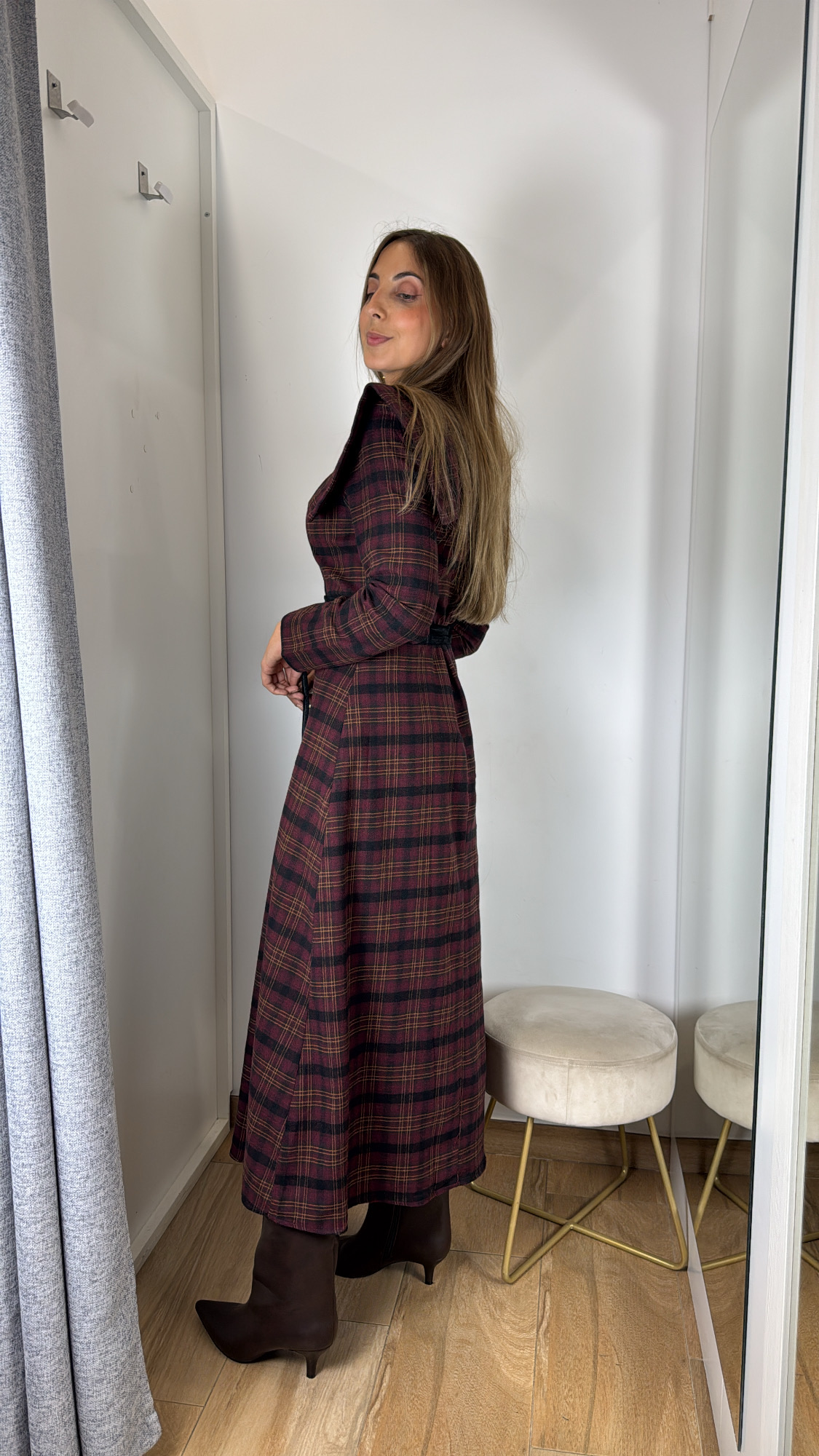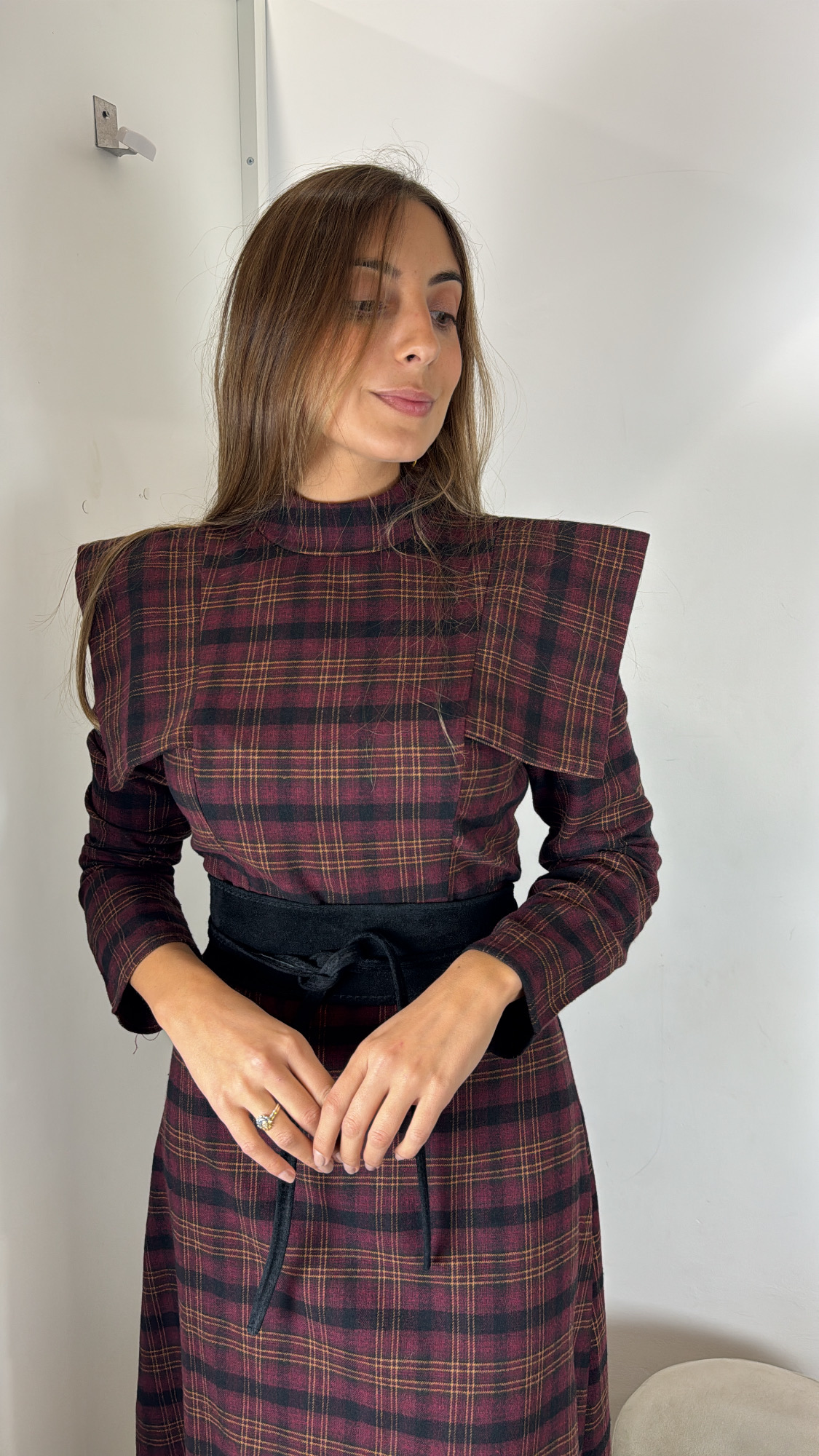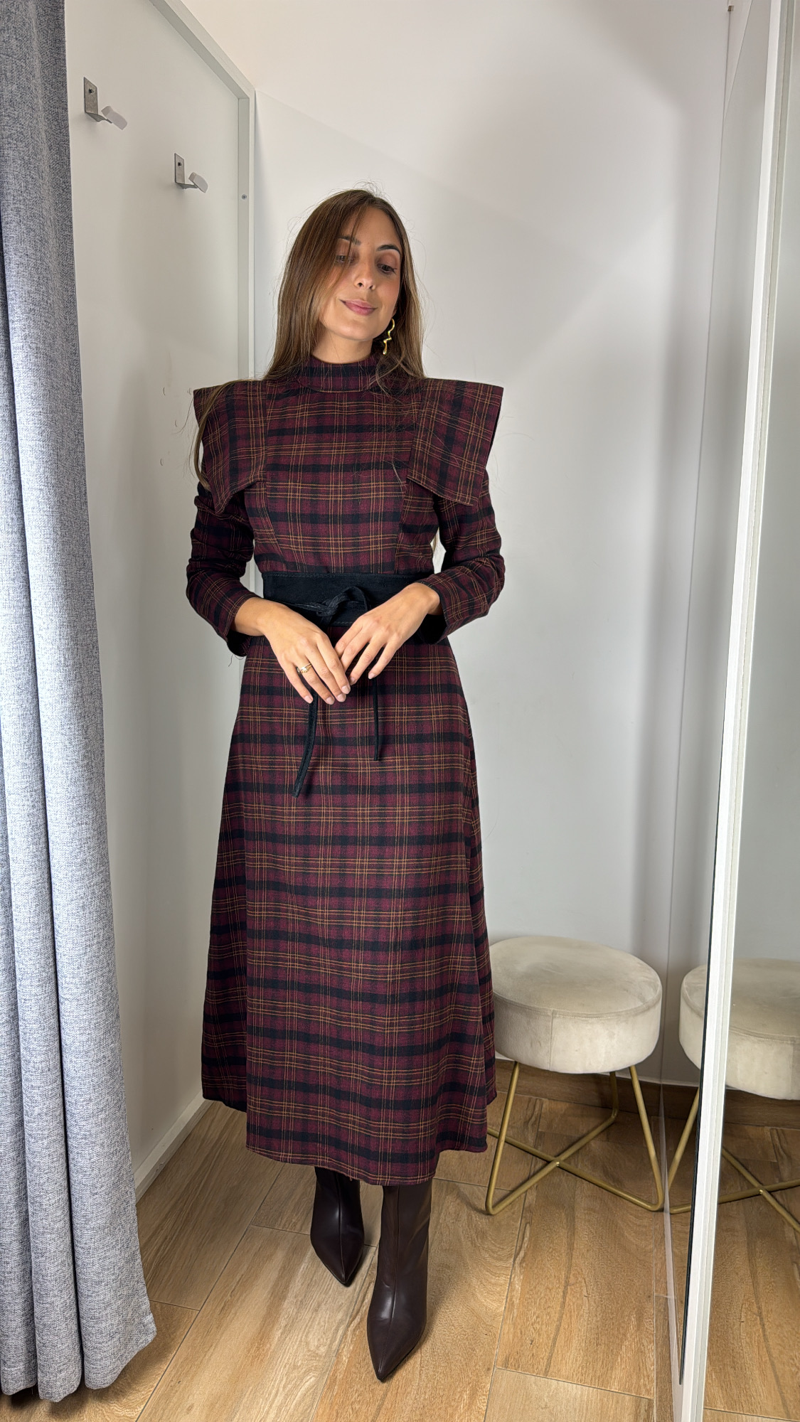 Vestido midi de pañito con estampado de cuadros en tonos Burdeos, camel y negro. Lleva los hombros estructurados y tiene cuello perkins, manga larga y corte entallado en la cintura que estiliza muchísimo.. Incluye forro interior y se cierra con cremallera por la parte de atrás.