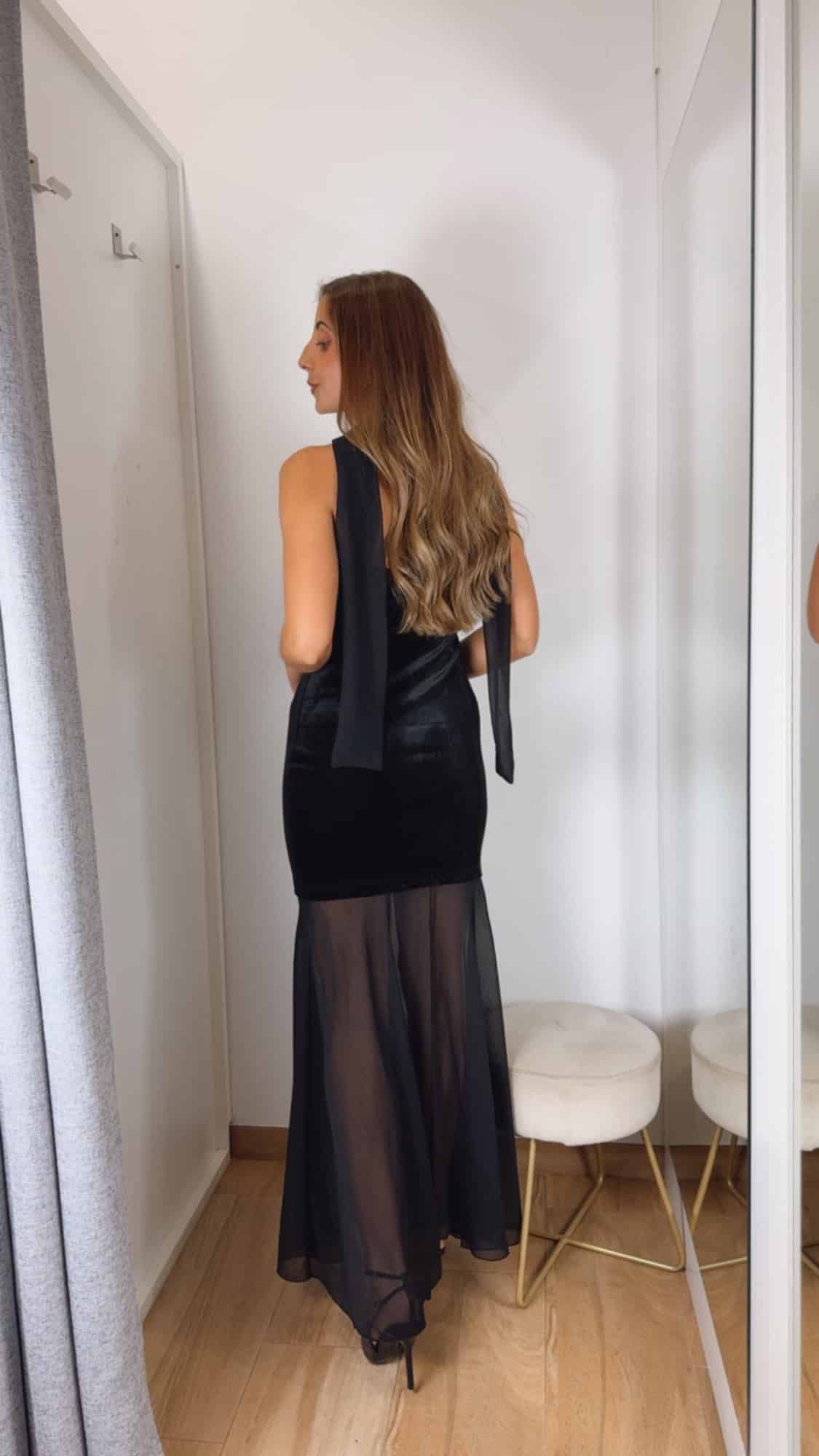 Vestido de en palabra de honor con la parte del cuerpo en terciopelo negro y la parte de la falda en tul transparente negro.