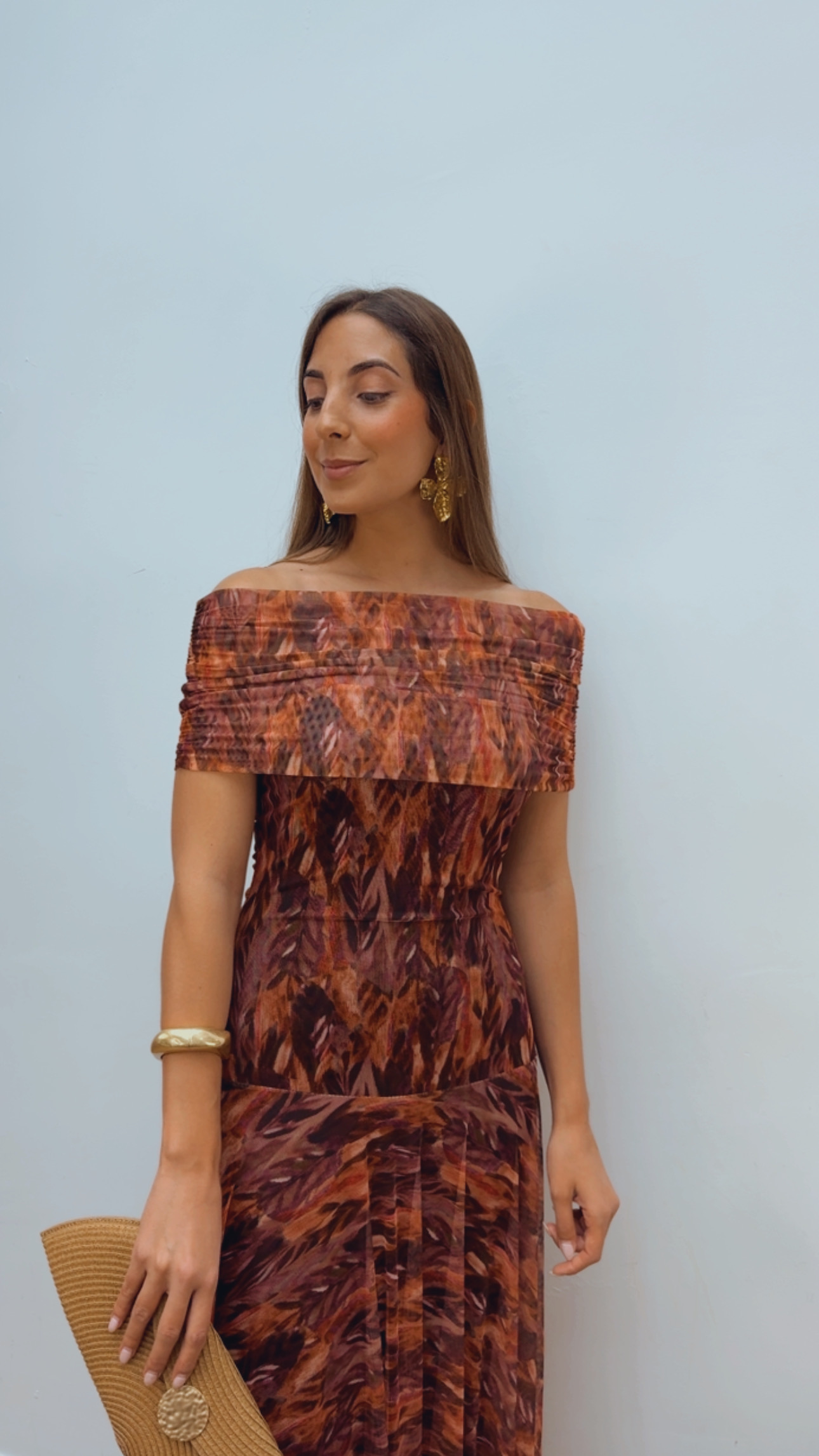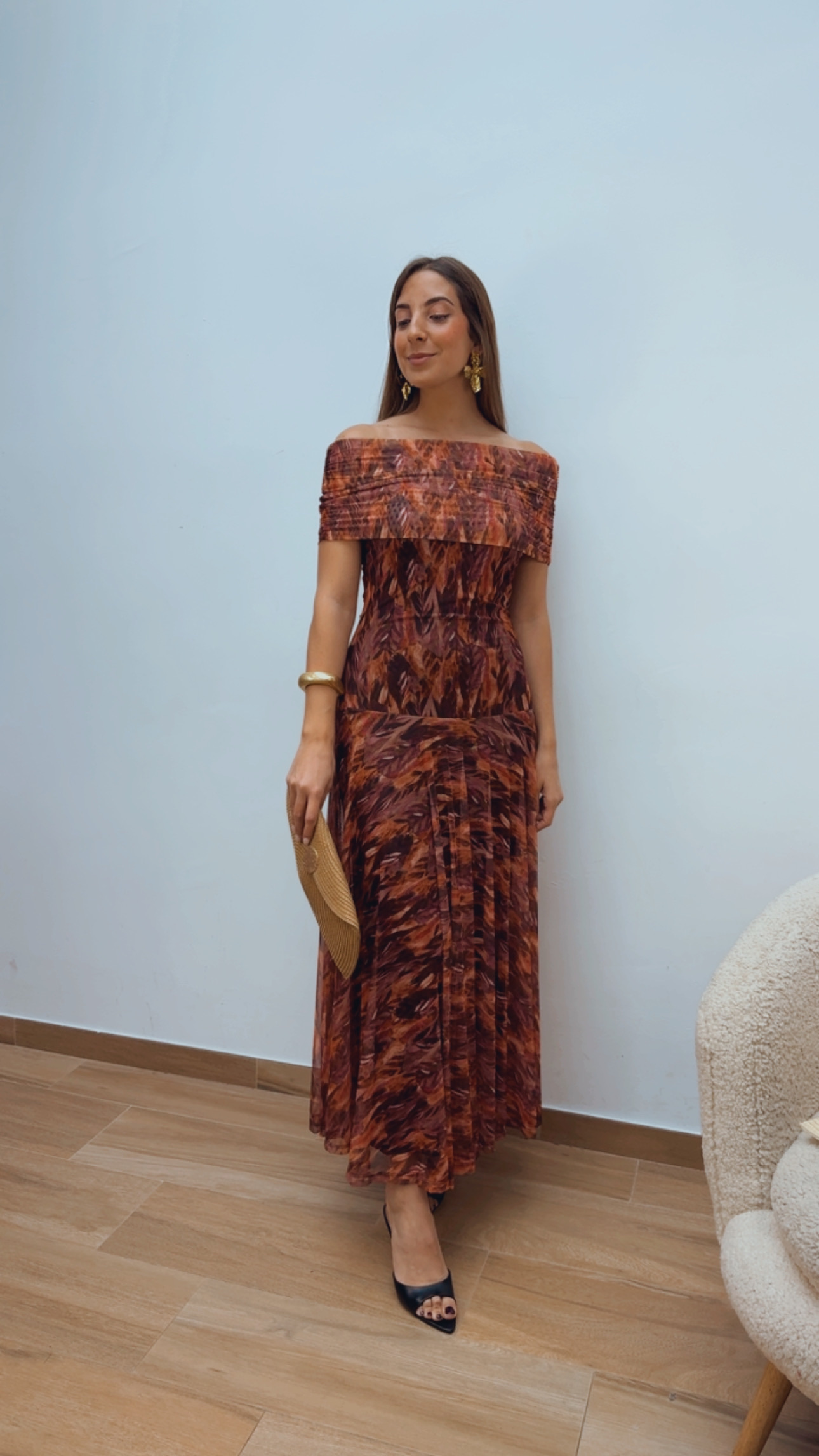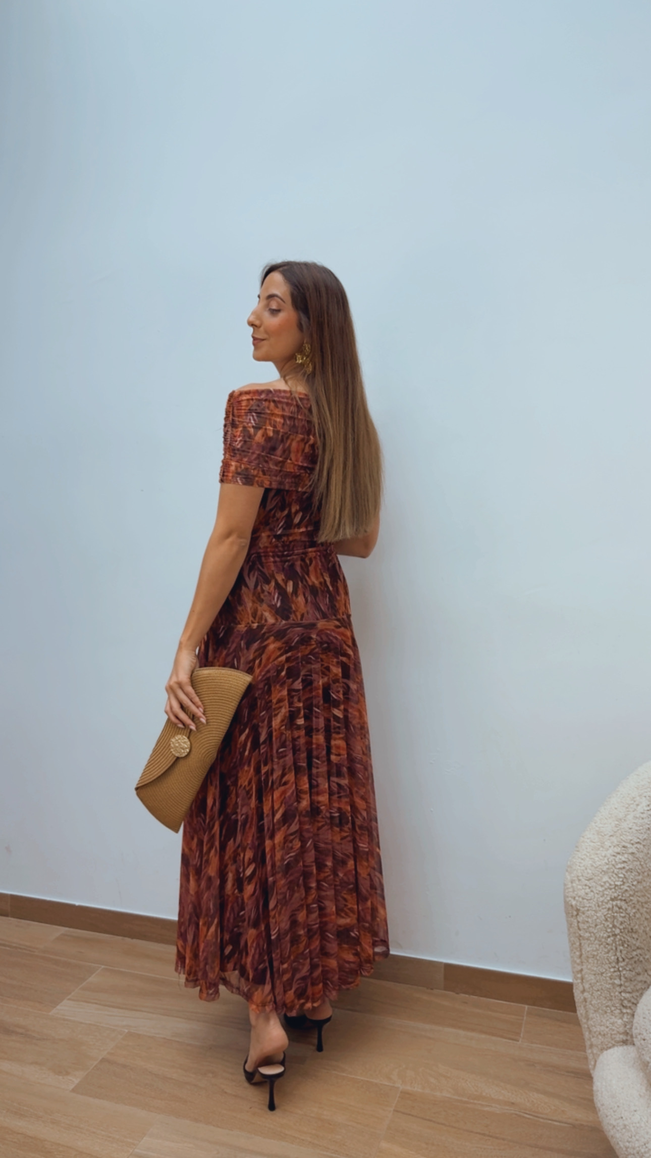 Vestido de tul en tonos teja y burdeos, con un diseño elegante y muy favorecedor. Está totalmente forrado, lo que aporta comodidad y un acabado impecable.